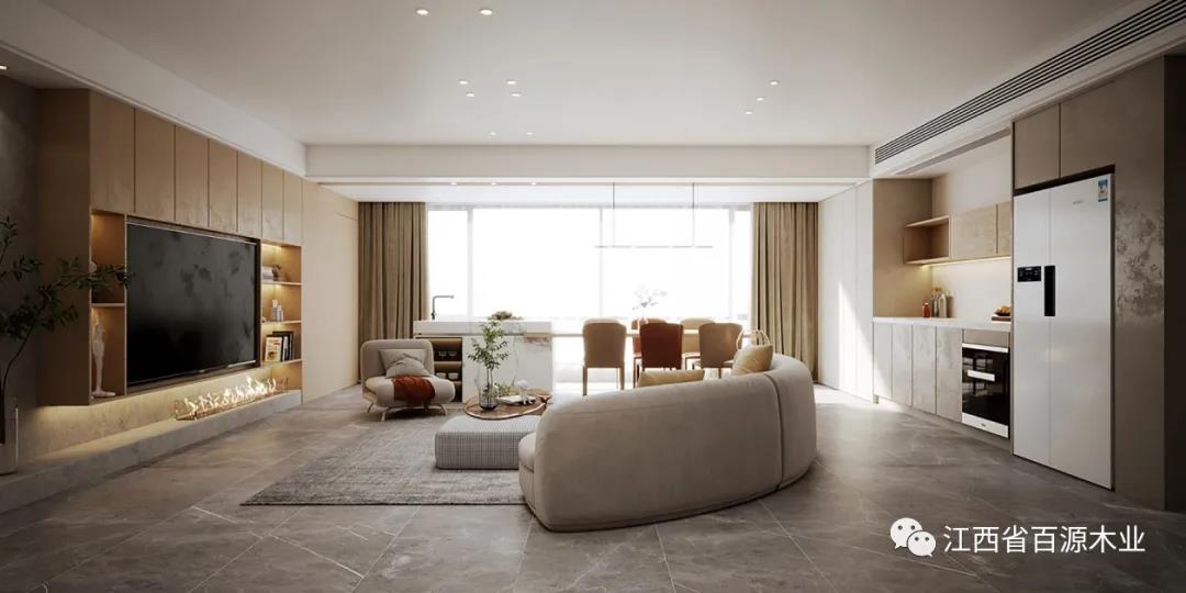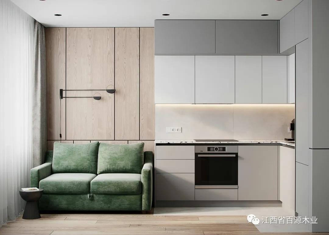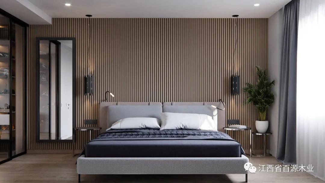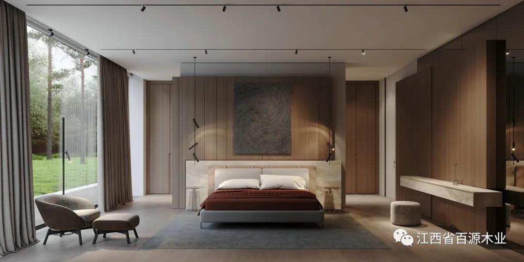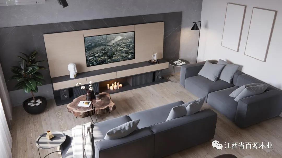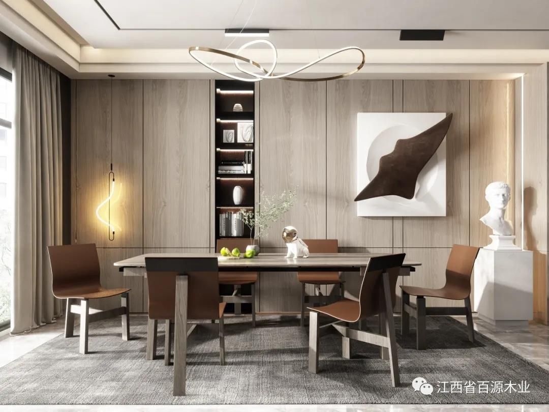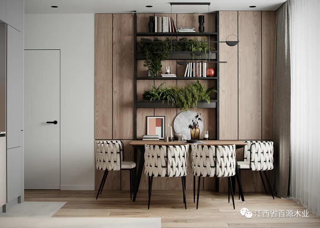 如果背景墙使用原木色板材,家具就尽量避免原木色,以免过于单调。反之,家具则可以以原木色为主。