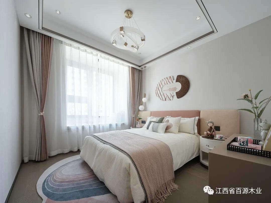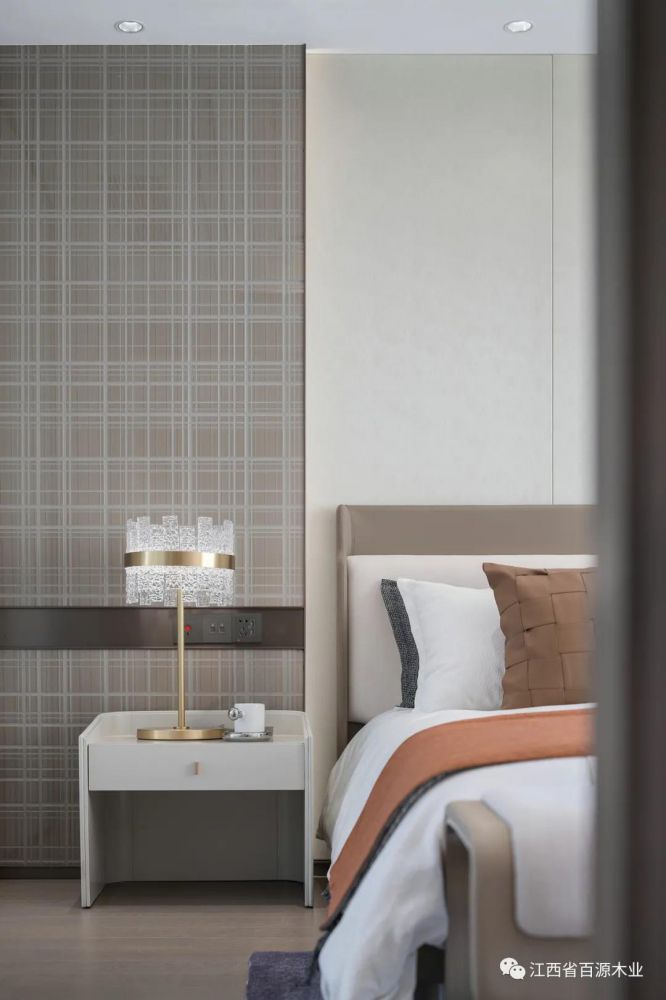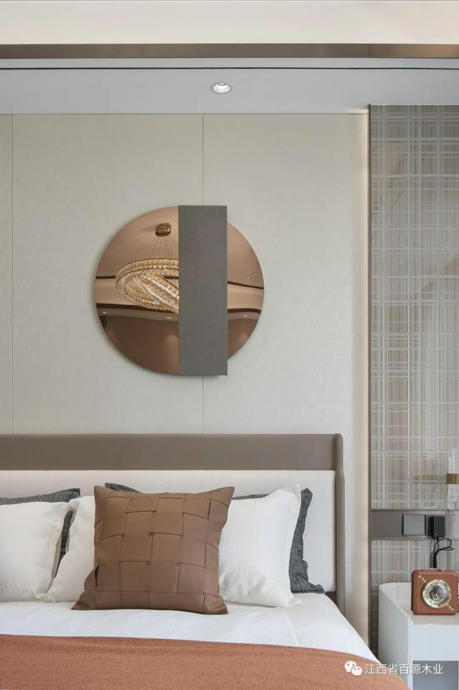 焦糖卡其色系的床品,则提供着巧克力般的甜蜜氛围,让居者对卧室心生依恋之感。而电子产品小度的加入,则赋予主卧更多的科技智能感。