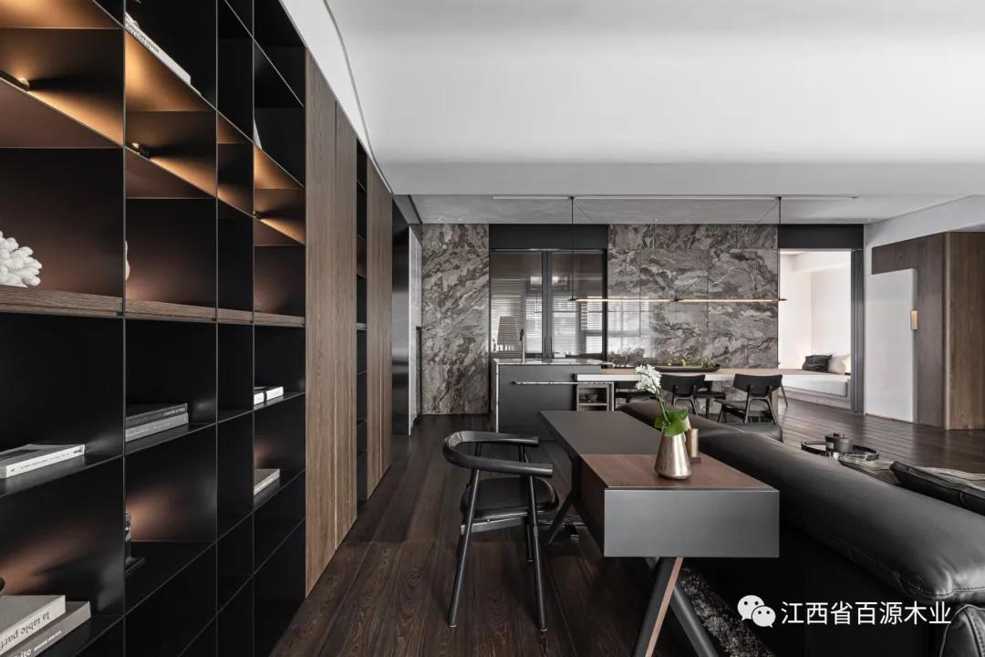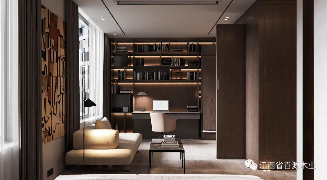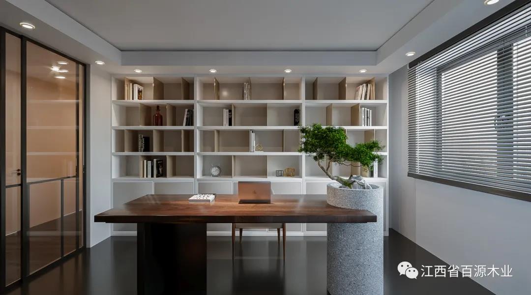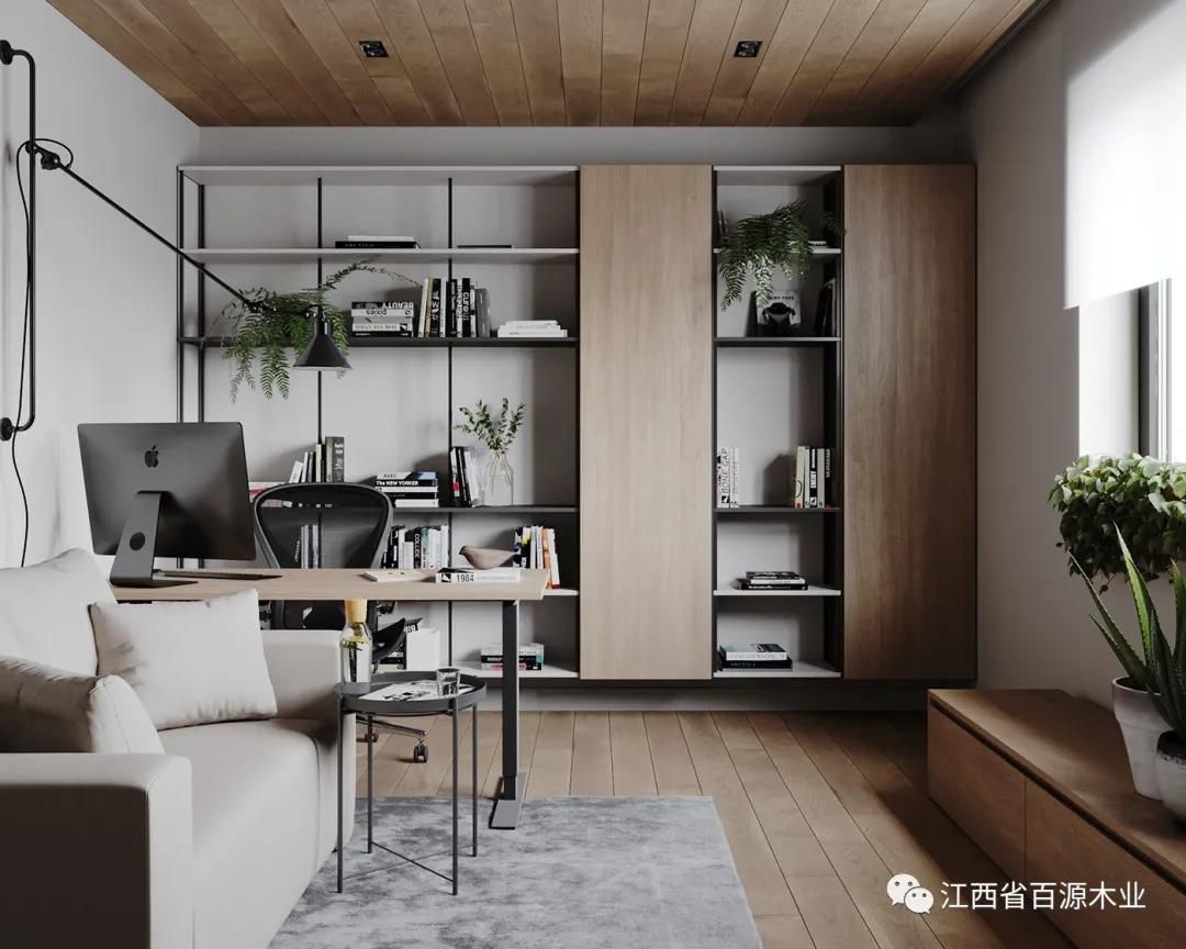 还有一种就是开放式的格局,在没有独立的空间做书房时,可以是在客厅、卧室等地方,设计出书房,简单放置书桌(或加上书架),面积虽小,但五脏俱全。