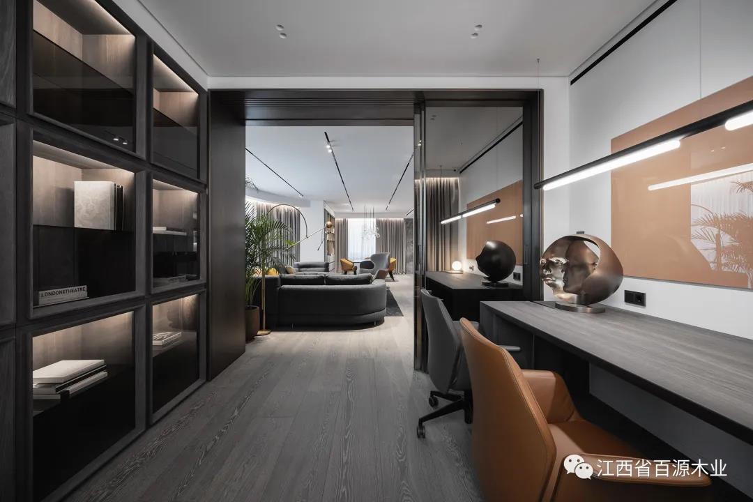 书房作为主要用来工作看书学习的空间,在桌椅的选择上就一定要以舒适为主,同时考虑到家具与人们活动所需的范围。书柜要保证有较大的放置书籍、物品的空间,深度以30cm为宜,太深既不方便拿取也浪费空间。