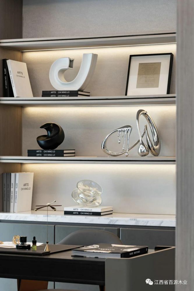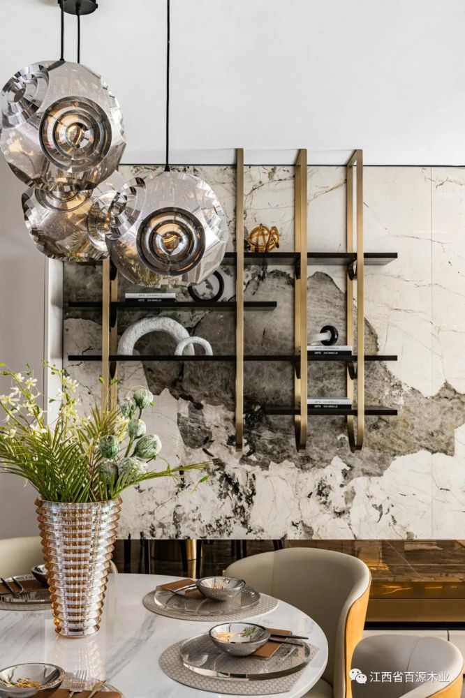 所有灯饰及艺术品均运用了温润柔和的圆形为基础,但是十分创意地将完整的圆进行分割,采用不同颜色调和每个半圆,进行拼接处理后形成极具高级感的撞色,在追求层次感与设计感方面展现得淋漓尽致。