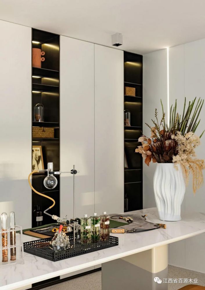 金属质地的小摆件也是彰显高级感的重要元素,如试管架等代表品质的精密仪器,烁烁反光的金属配饰,与玻璃搭配的吊饰,富含高级感的元素混搭尽显轻奢风格。