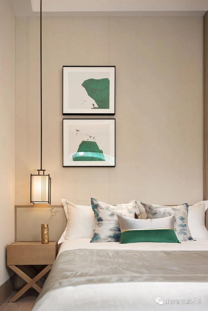 以“万绿河源”的“湖绿”为搭配色渊源,空间局部以雅绿点缀,地毯、布艺、盘垫、挂画、物件……呈现细微的色彩表情,低调不失雅致,质感兼具品味。