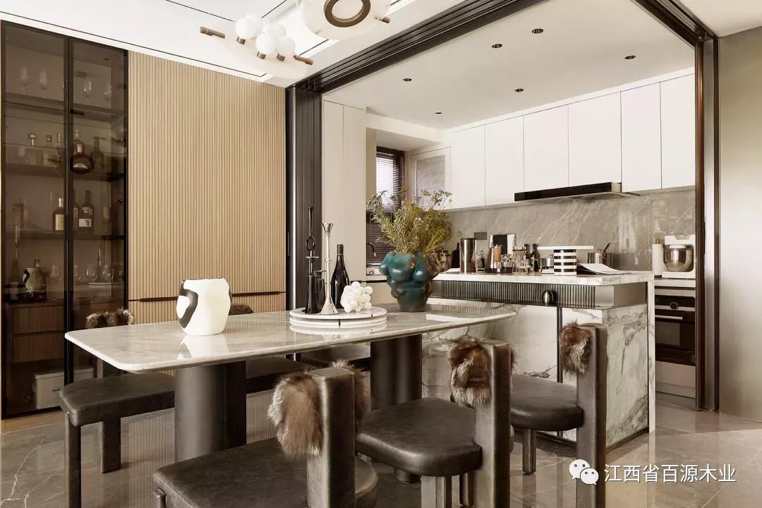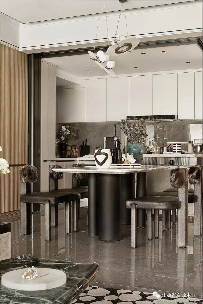 现在的家庭的餐厅已不再仅仅是一个进餐的地方,利用通透创造出区域间的隐秘体验,将优雅注入每个空间的细节里,作为设计者将所有人在居所中的生活习惯都考虑到,达到整体空间流畅的布局和使用体验。
