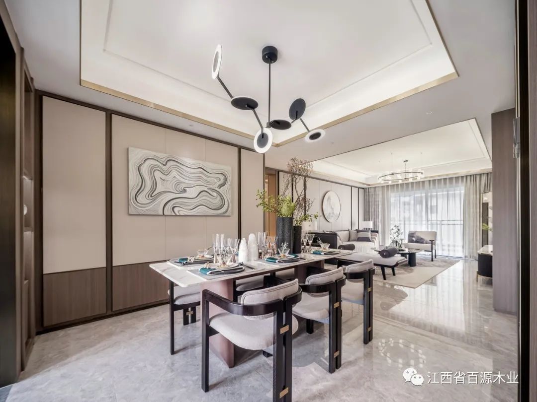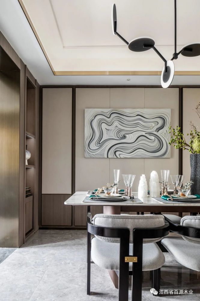 客餐厅空间衍脉自深厚邈远的传统文化,从家具的形制、流线、色泽,到挂画,均镌刻着东方诗性的肌理,流露出自信大方的悠悠风骨。