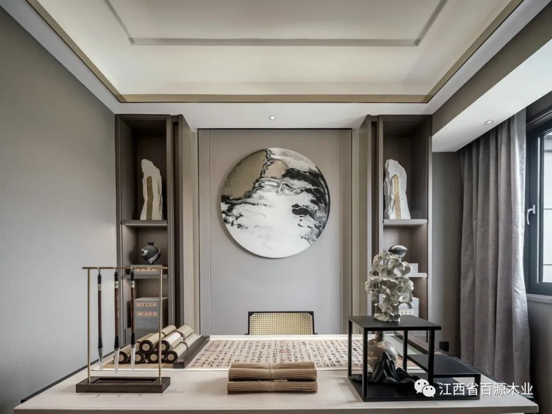 书房的设计,整体空间从结构上呈现出新中式独特的对称美,给人以庄重大气、有条不紊的视觉享受