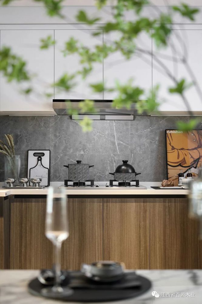 开放式餐厨空间相互连通,功能各自独立,装点上绿色,细腻的质感在静谧氛围中,诠释令人心动的优雅品质。偶尔下午茶或陪伴孩子同时可以在这里兼顾工作的需求,使得这里也能成为家庭的社交中心之一。
