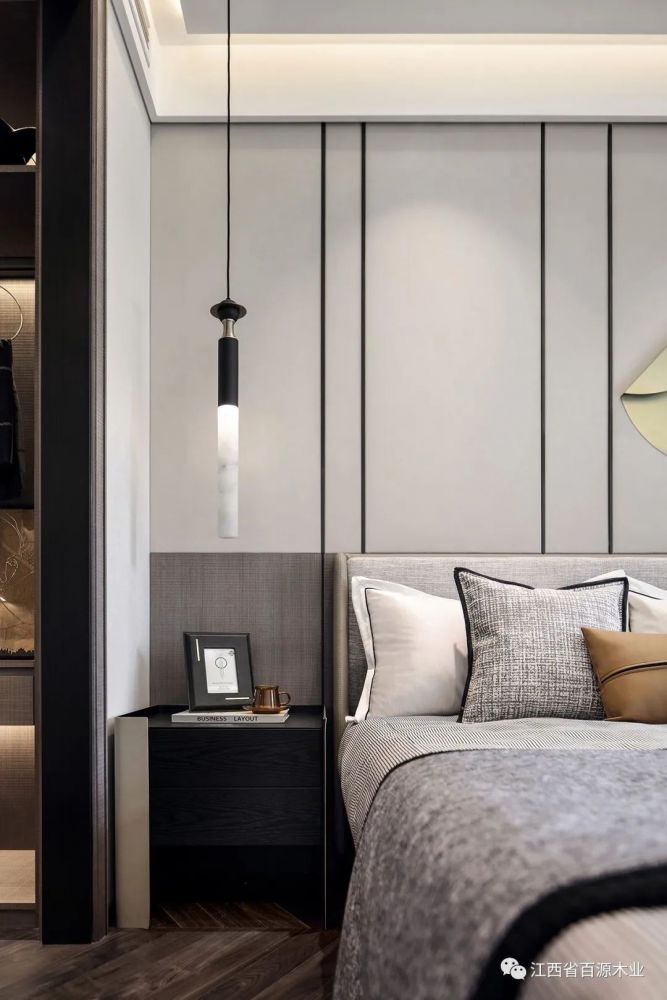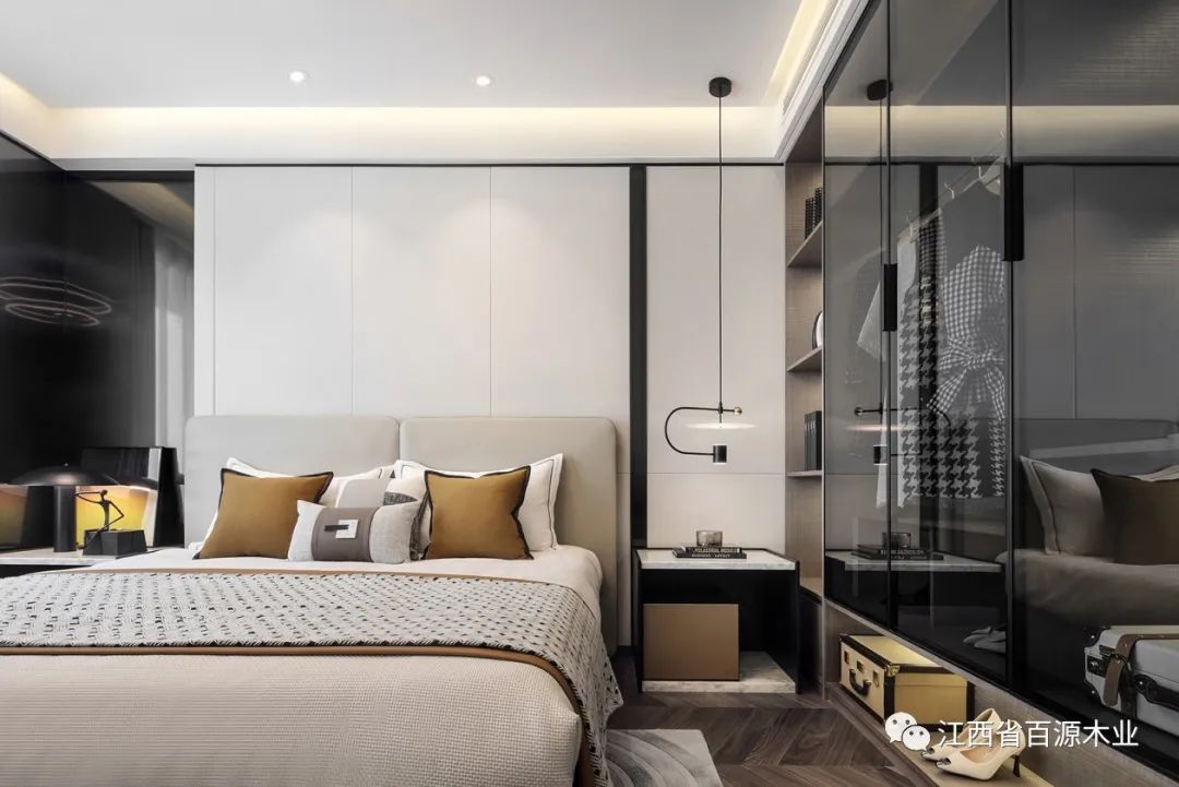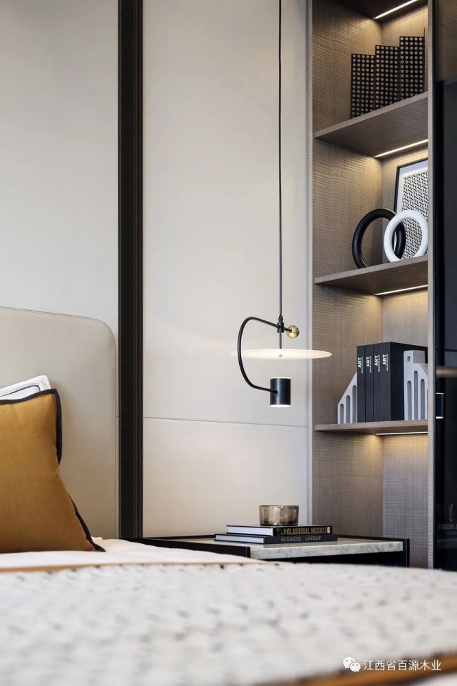 卧室延续了客餐厅的感觉,让休息更纯粹,让空间更柔和,在现代风情的纹理里,觅到白茶清欢无余事的写意。