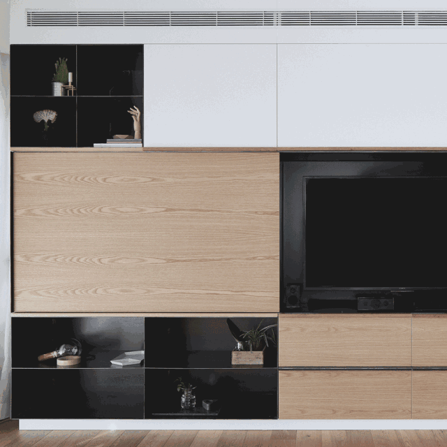极简风是近两年非常流行的风格,所以定制的电视柜系统也会与极简的风格相搭配,比如无拉手,体块碰撞,悬浮的设计,都可以在极简风格的室内用作电视柜的定制。