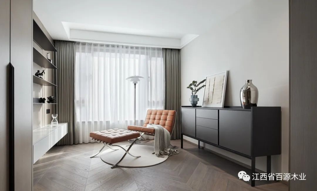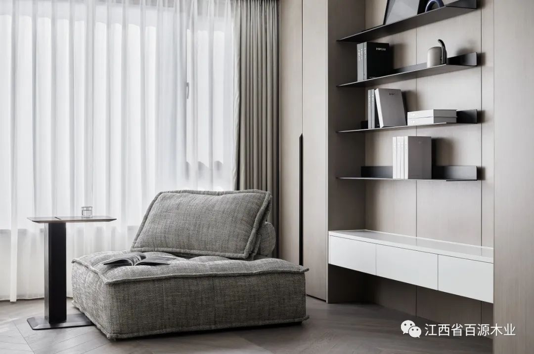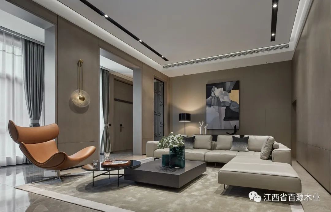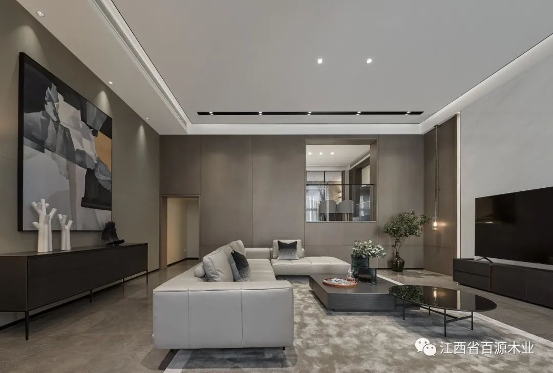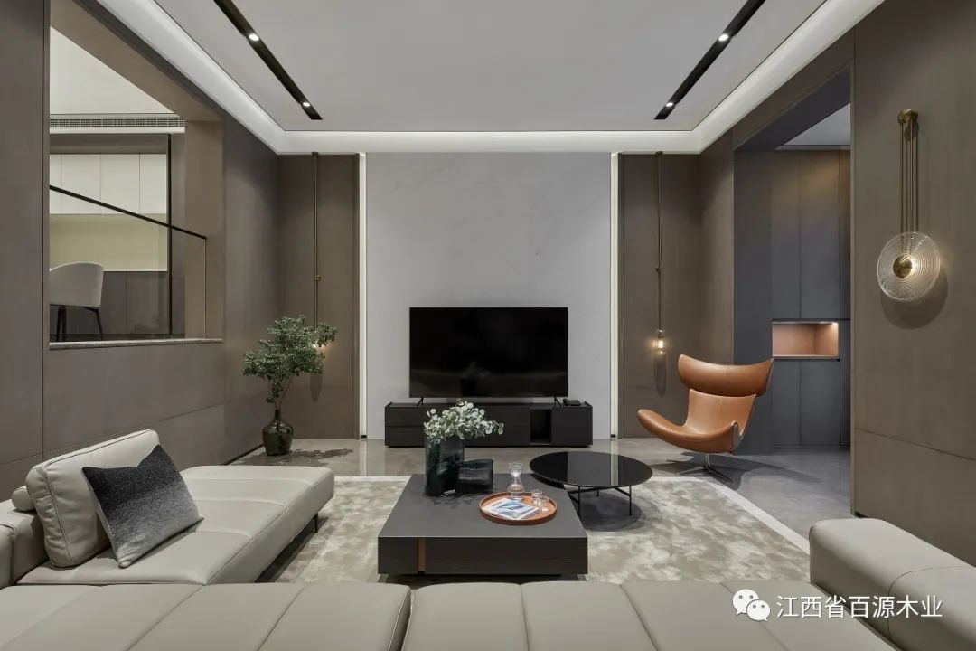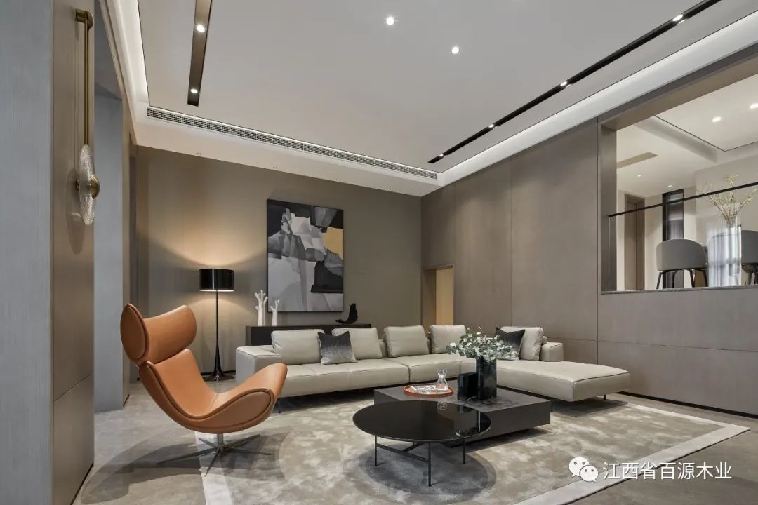 客厅整体设计采用全屋围合方案,顶天立地,墙板与门与柜子浑然一体,不是表面的富丽堂皇,而是骨子里内敛低调的气质。