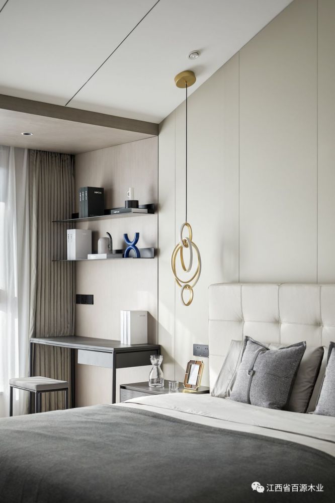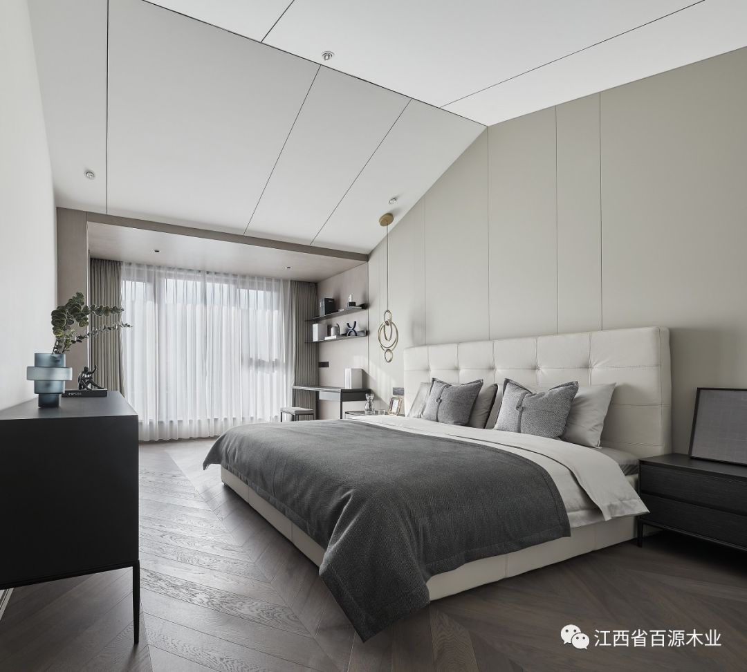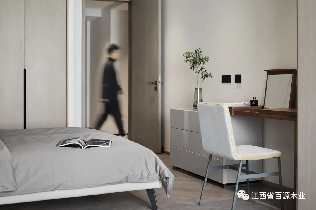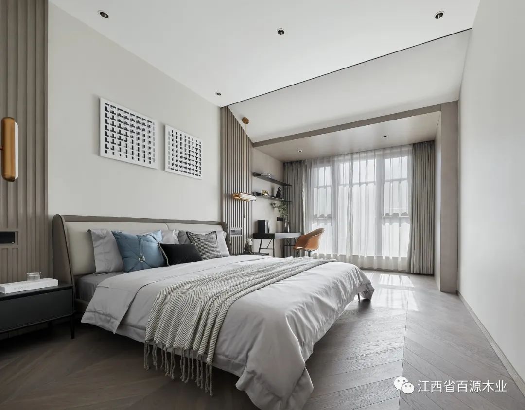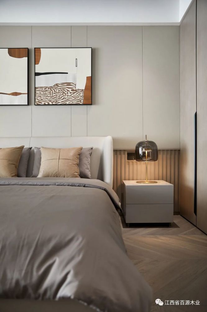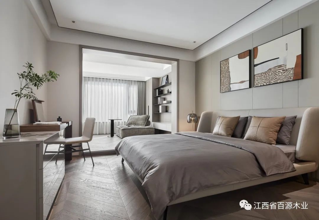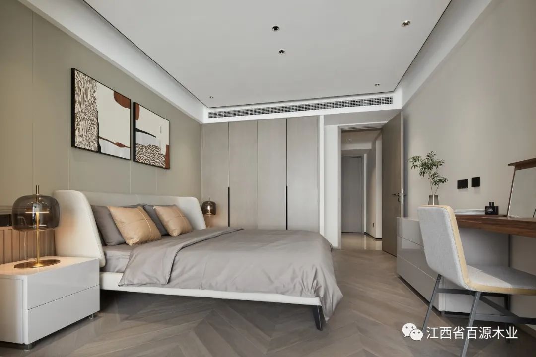 主卧延续了客厅的简洁素雅的感觉,让休息更纯粹,空间更柔和!空间的柔软之处体现于家具、床品的品质,构建身体尺度的舒适与放松。
