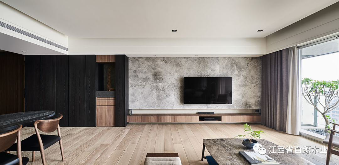 走入客厅,视觉循着光线从右至左,温润的白橡木逐窗前行,通顶展开一排多功能壁柜,立面将功能属性按照次序投放,分别衣物柜与储物用途外,在染黑橡木中抹上一道胡桃木色泽,退出方寸境地当作神龛位置。