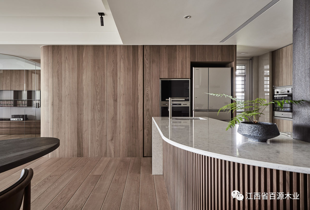 开阔明亮的厨房区域,源自从玄关蔓延一道圆弧中岛形成柔性介质,将台面细裹上具有优美纹理、高硬度的石英石,以纯净色泽画下清晰分线,立面则承接格栅元素。