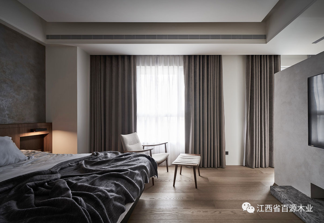 转入屋主卧室的区域,一抹温厚锈蚀痕迹映著斑驳光影,经由艺术涂料堆叠手感温度,衔接著温润木质背板,以一体形制构成对称床头柜,分别佐以二盏床头灯,使夫妻俩自行调整光源明暗,各自拥有最为舒适的休眠光氛。