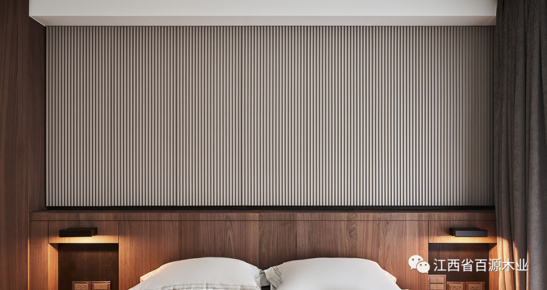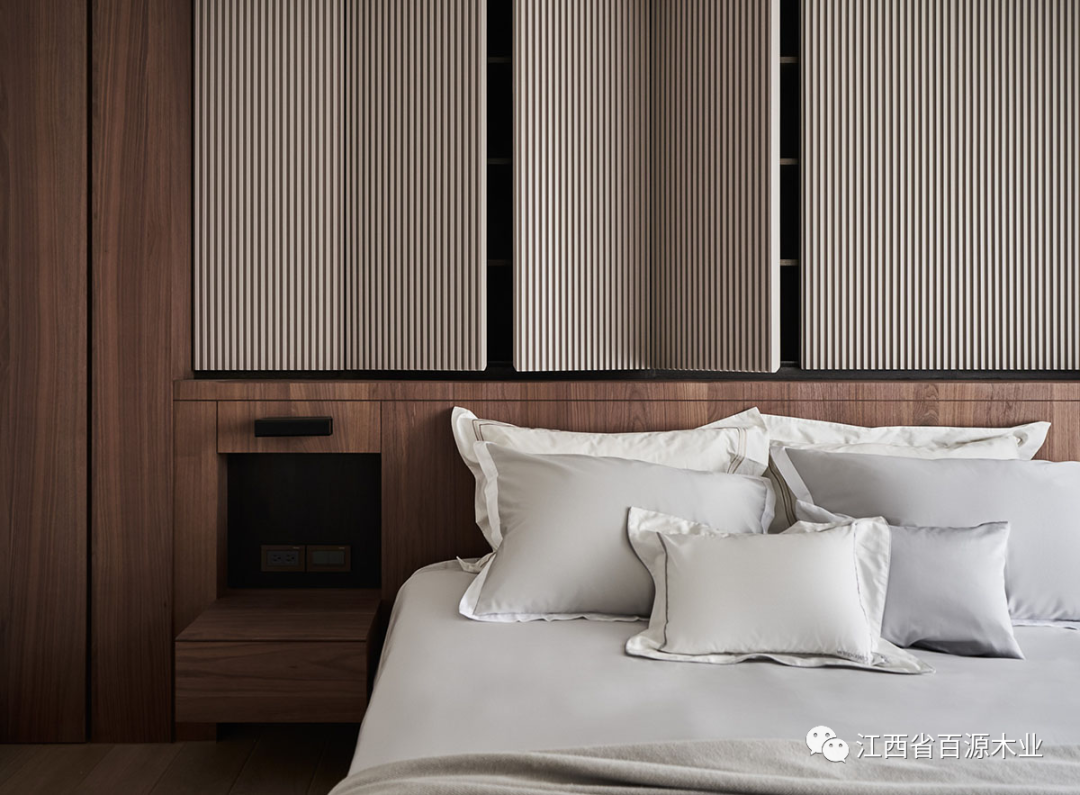 次卧主要是给予时常旅外的女儿,归返时有一处温暖休憩空间。延续主卧室设计逻辑,以温润木质砌构床头墙,蔓延而上,保证视觉整体感同时为空间作了功能区分。