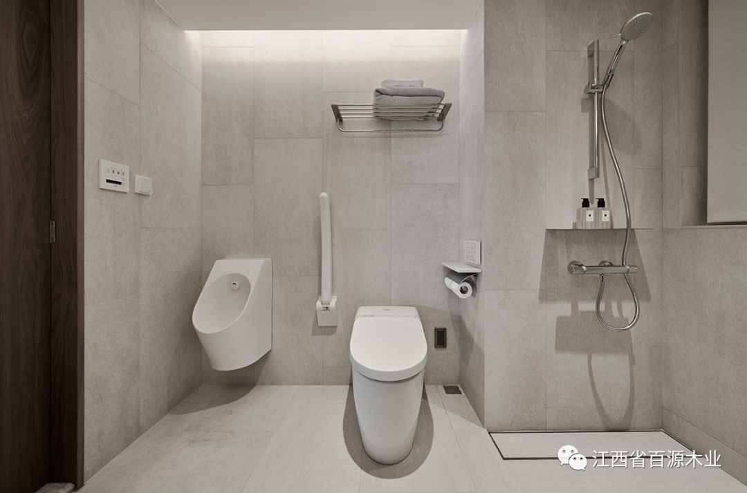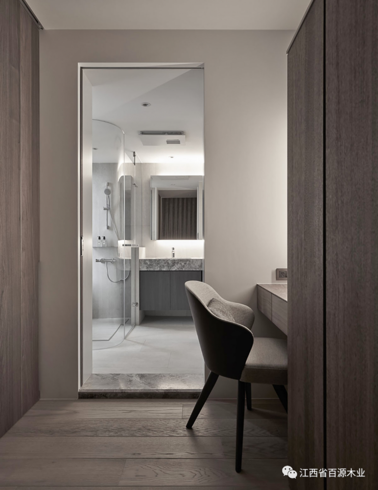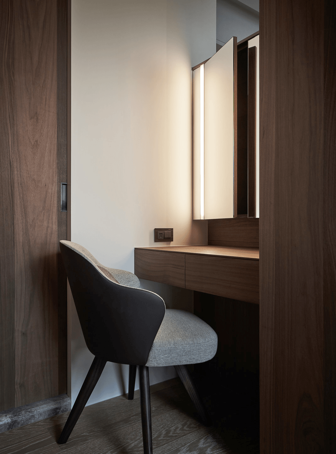 从卧室延伸,以衣物间串起寝卧与卫浴的空间距离,梳理出流畅沐浴动线。将化妆桌视作分界点,减缓高柜的压迫感受,同步于镜柜镶嵌铝条灯,成为梳化与夜晚时的辅助光源。