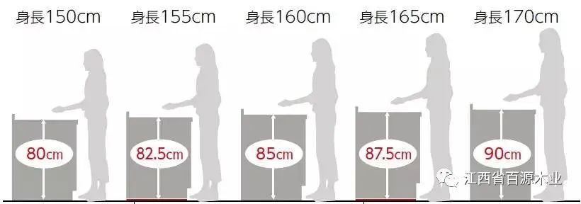 科学反复试验得出,厨房操作台的高度一般为85~90cm最佳,这个高度正好是身高1.6米的女主人手臂自然抬起的高度。