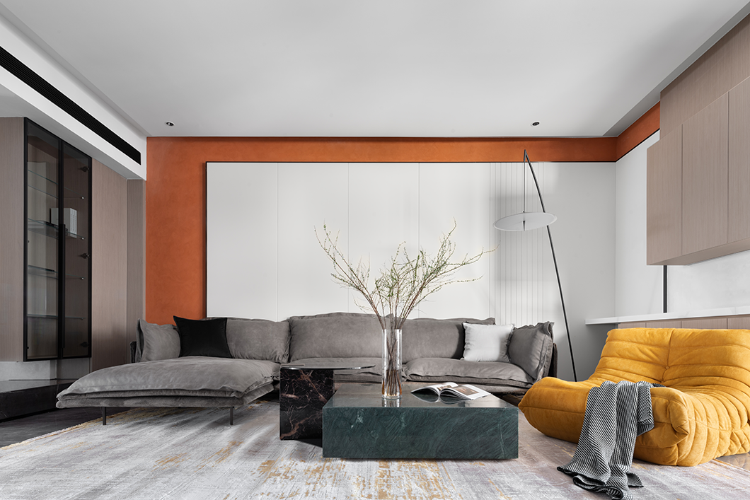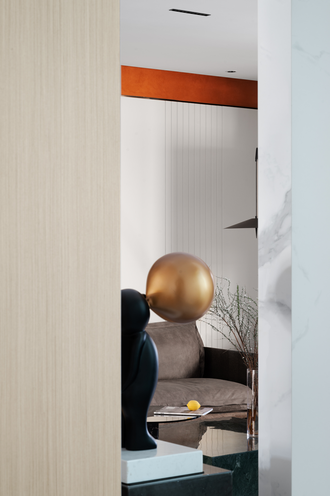 场域的精神空间不应被面积尺度所局限。空间以白色木饰面为基调,搭配爱玛仕橙的背景让艺术感提升。灰色的绒面沙发散发温暖静待入座,线条吊灯恰到好处地点缀其中,细述了场域的情感交集。