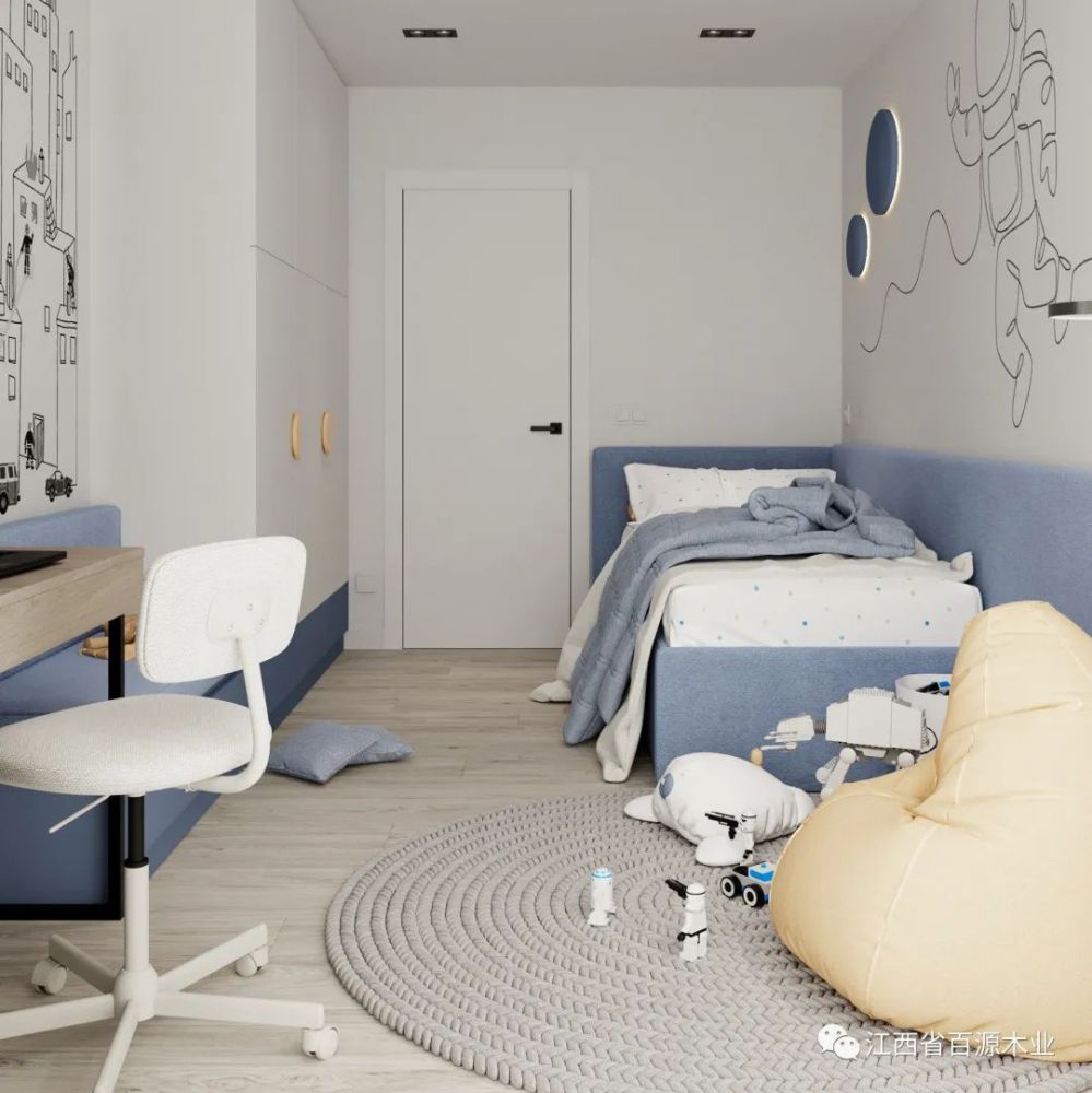 同时过于鲜艳的颜色如果长期冲击孩子的视觉,那么会降低孩子对其他物体的颜色的辨别度。所以儿童房设计,最好以浅色明快的颜色为主。浅蓝色、浅粉色、米白色等淡雅色调,都是儿童房常用颜色。