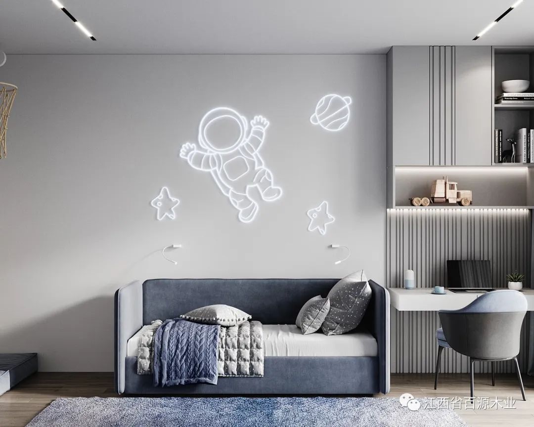 儿童房的设计往往不是一成不变的,随着孩子越长越大,对儿童房的诉求就会越来越高,在设计儿童房间初期时,应该在保证了收纳空间后,尽量留空。