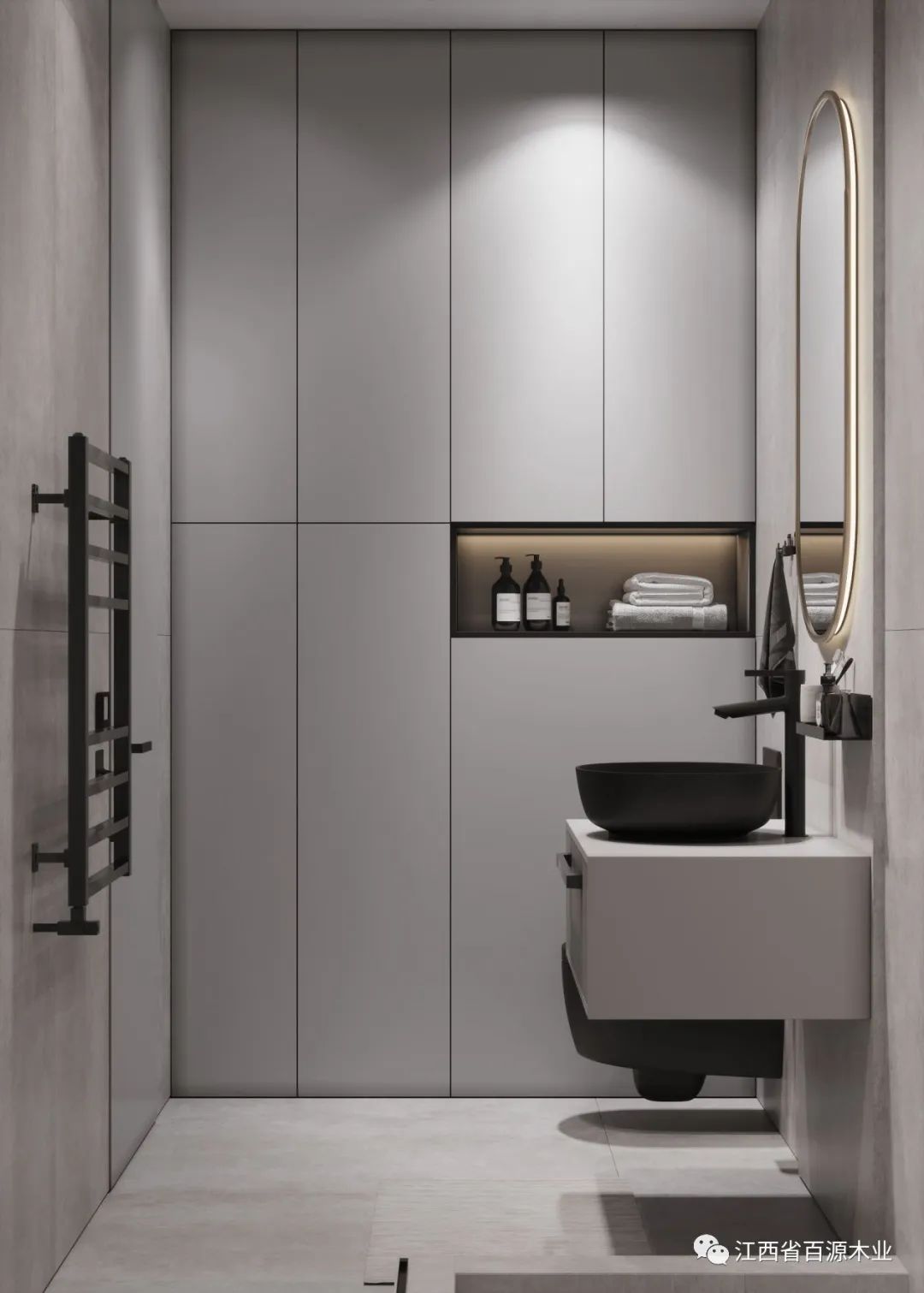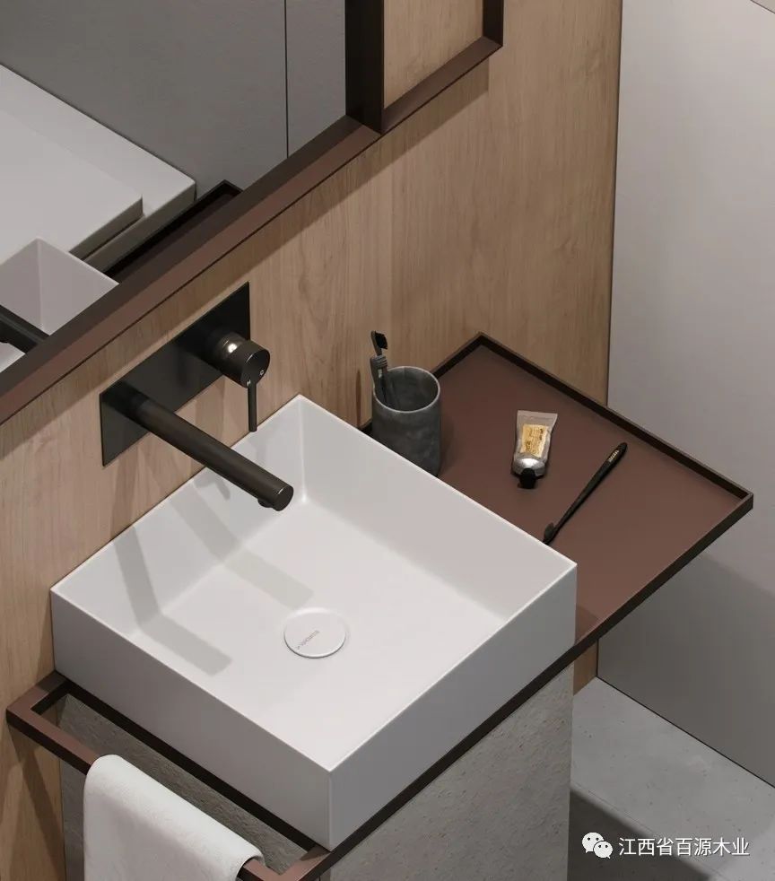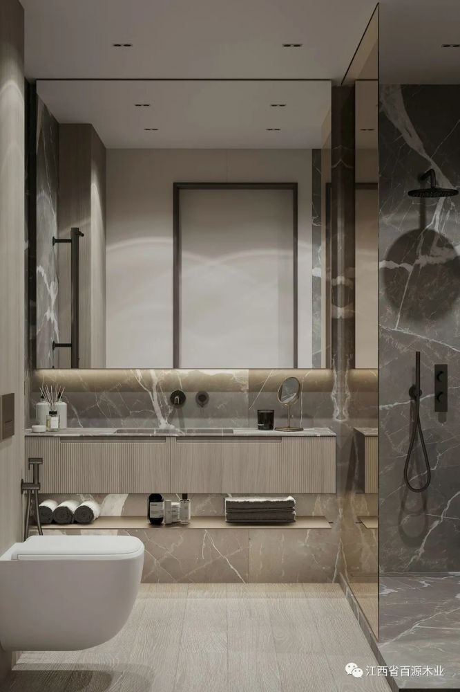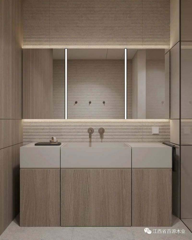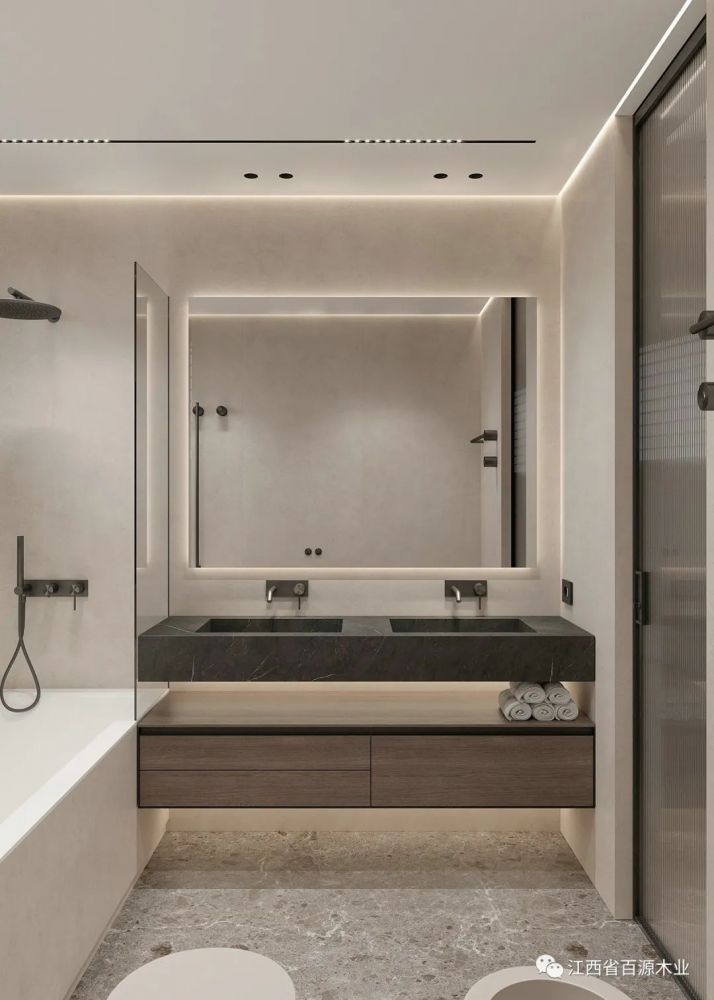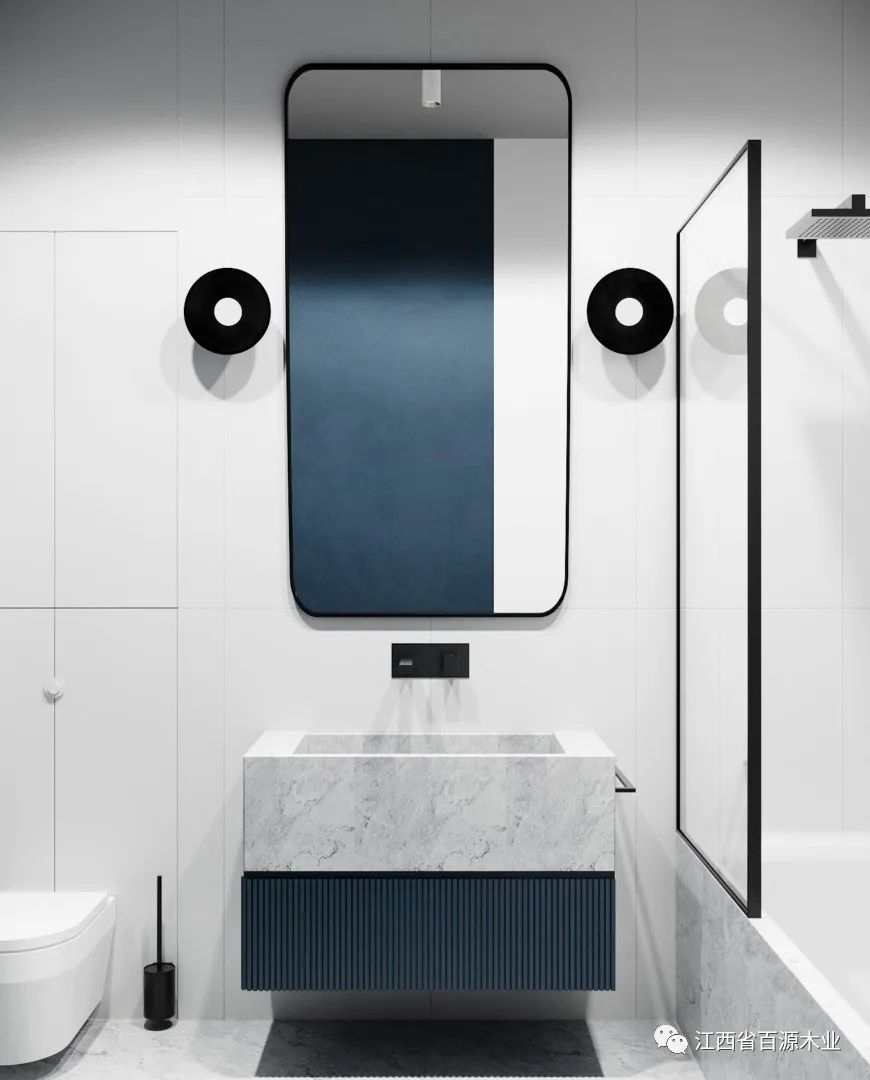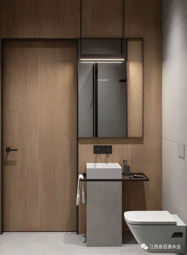利用大镜面和镜前灯来补充光源,就是一个非常实用的办法。一来可以打出均匀的光线,保证每个暗角都能充满光亮,二来也方便刷牙洗漱,对于女生还能更好地化妆。最大化地弥补光线不足的缺点。