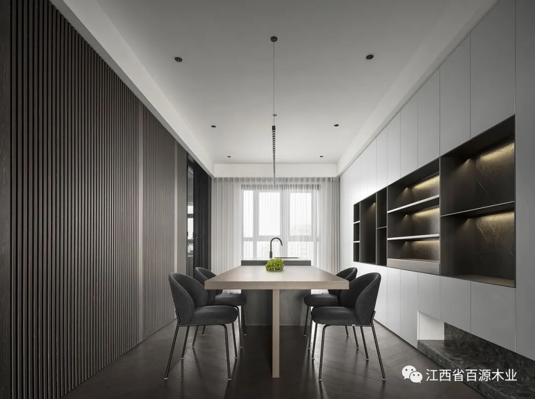 黑白撞色餐边柜简洁优雅,暖色线灯烘托家的温馨氛围,享受与家人一起用餐的美好时光。