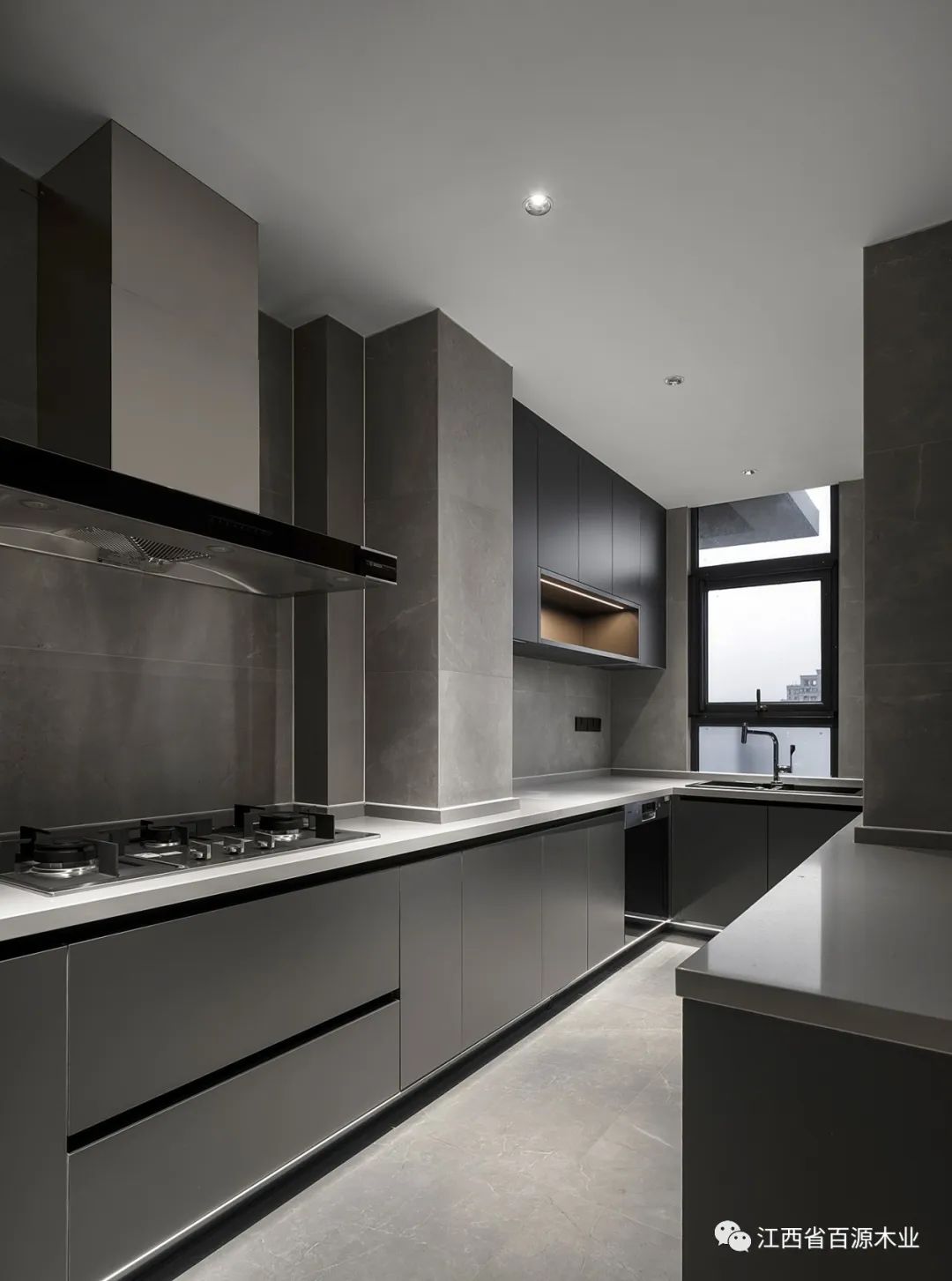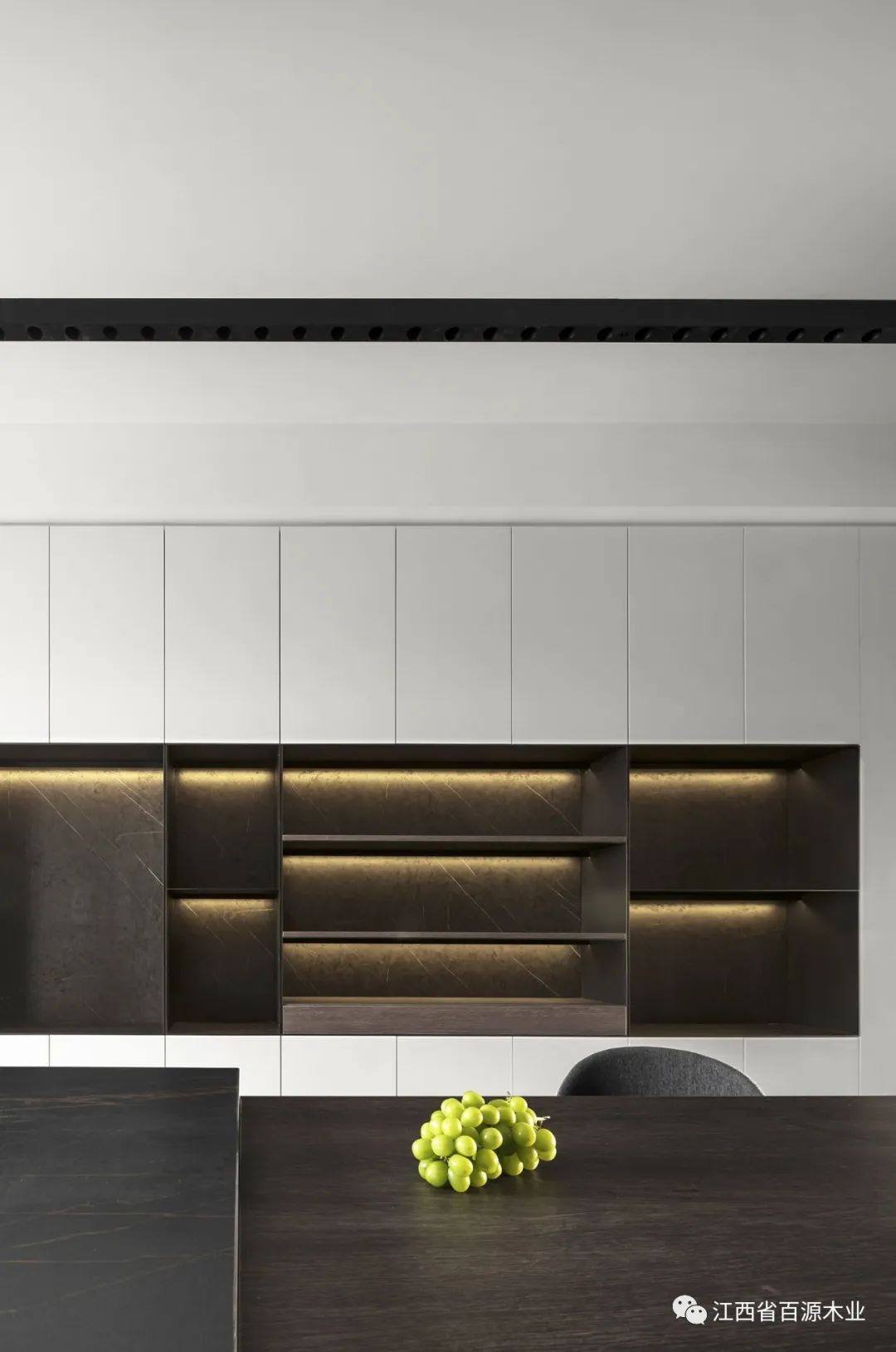 用清爽的色彩打造干净怡人的烹饪环境。无柜门把手设计免去把手的累赘,将更多使用空间归还给生活本身。