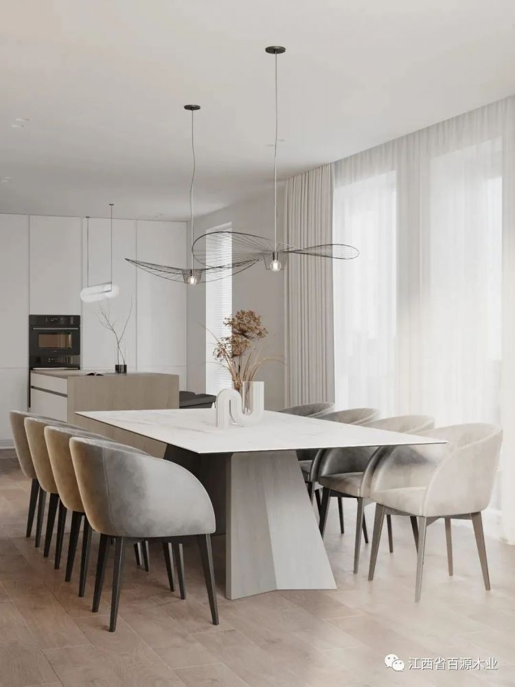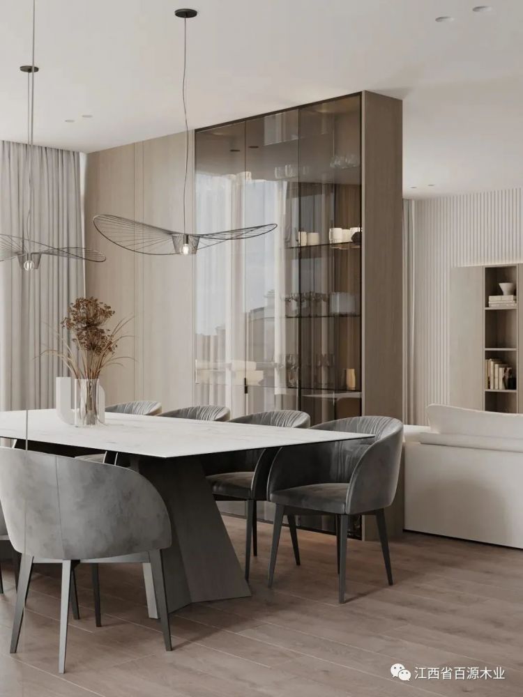餐桌与皮质餐椅,带来更具舒适、温和的视觉体验,玻璃与木饰面相嵌的餐边柜,通透而具有质感,让客餐区域保留各自的独立性,又相互沟通。