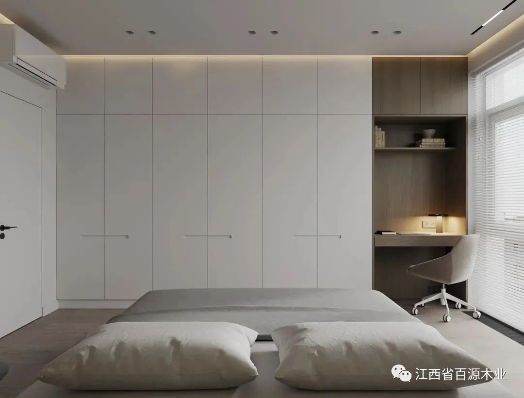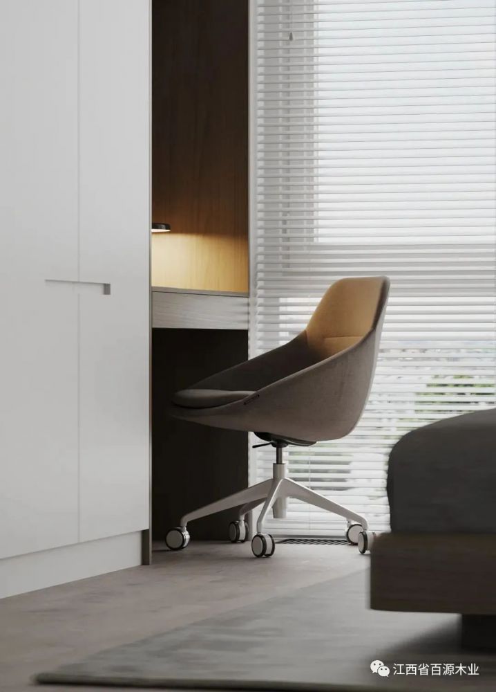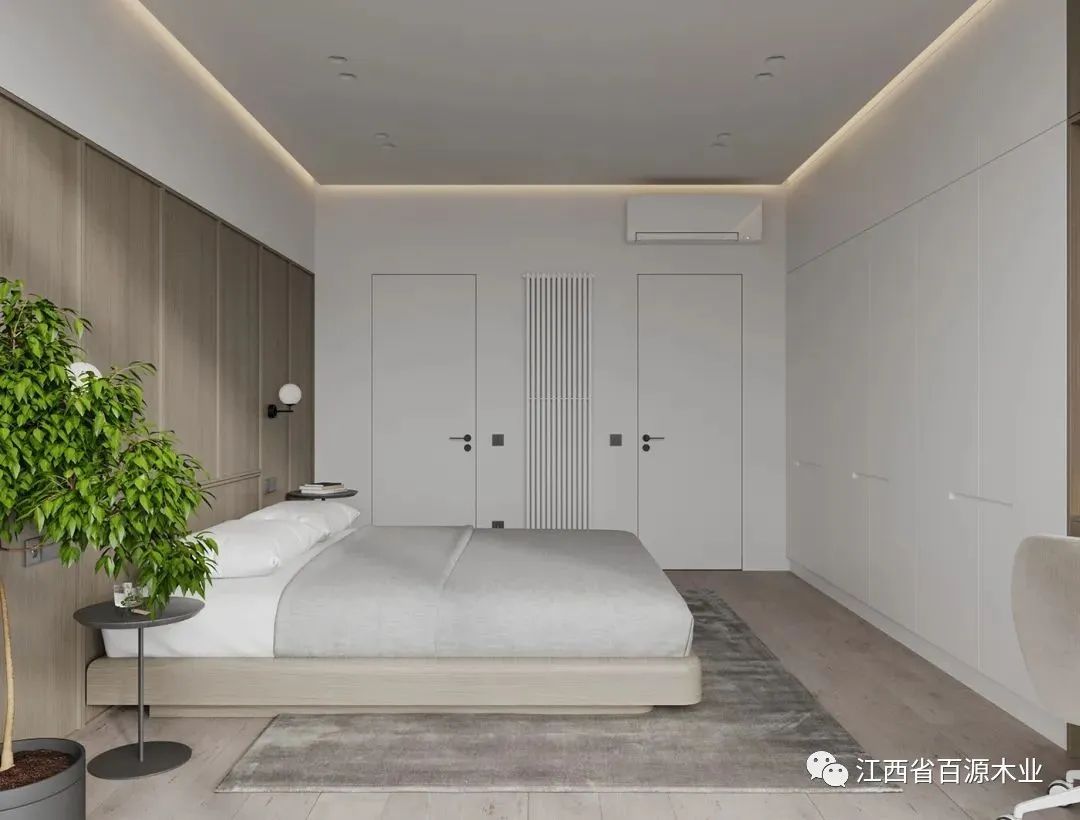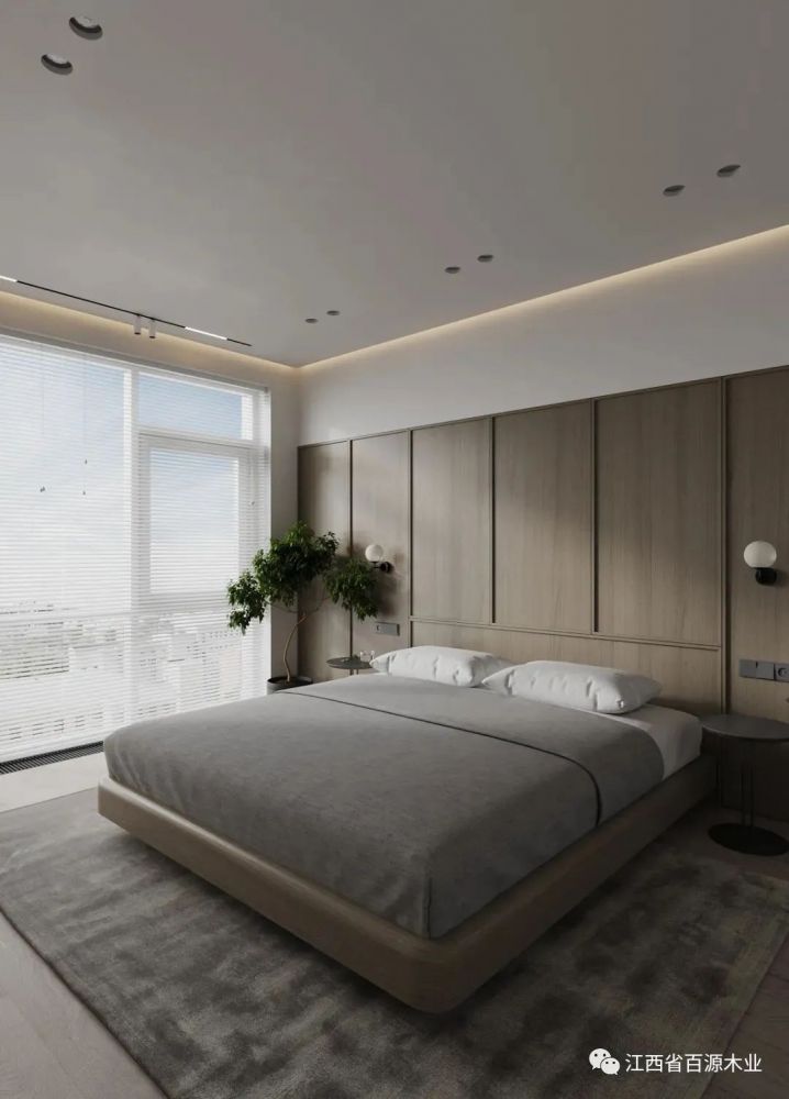 次卧,以温润的木色与白色带来简约的高级感,微水泥与木饰面组合的背景墙,在隐藏灯带的映衬下,呈现优雅气质。