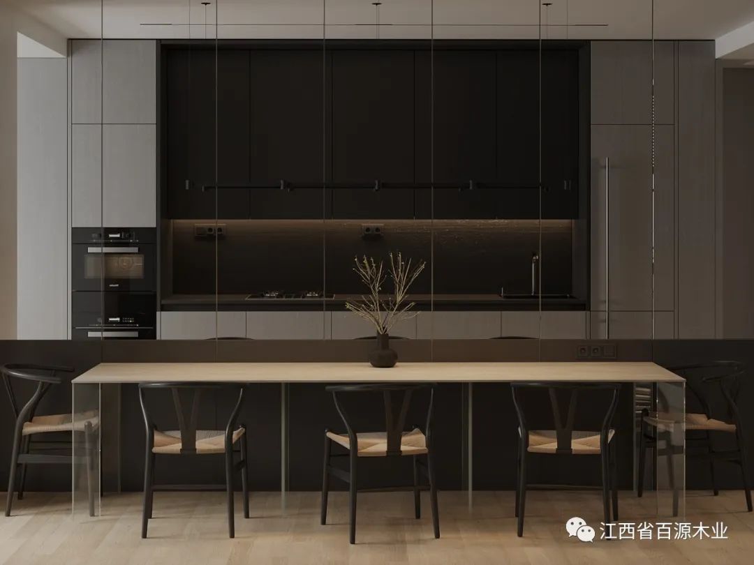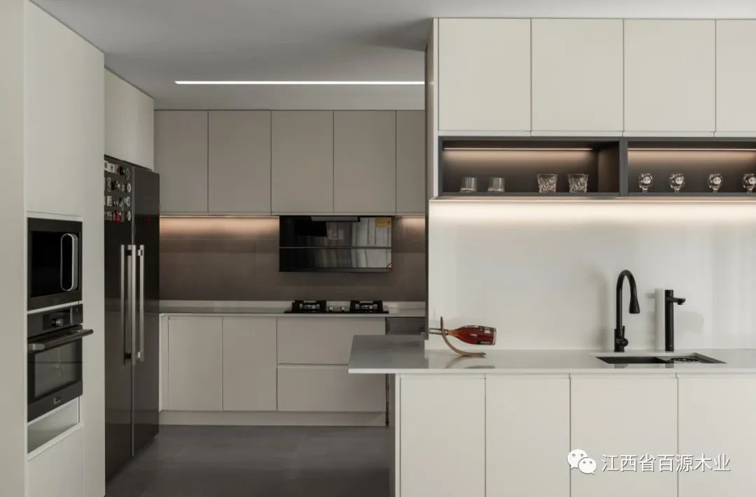 开放式厨房的橱柜设计,要以隐藏式的收纳为主,规避格子间,实现台面"空无一物",将储藏、洗涤、烹饪等功能设计得更加简洁和隐蔽,做到功能与颜值同时兼具。