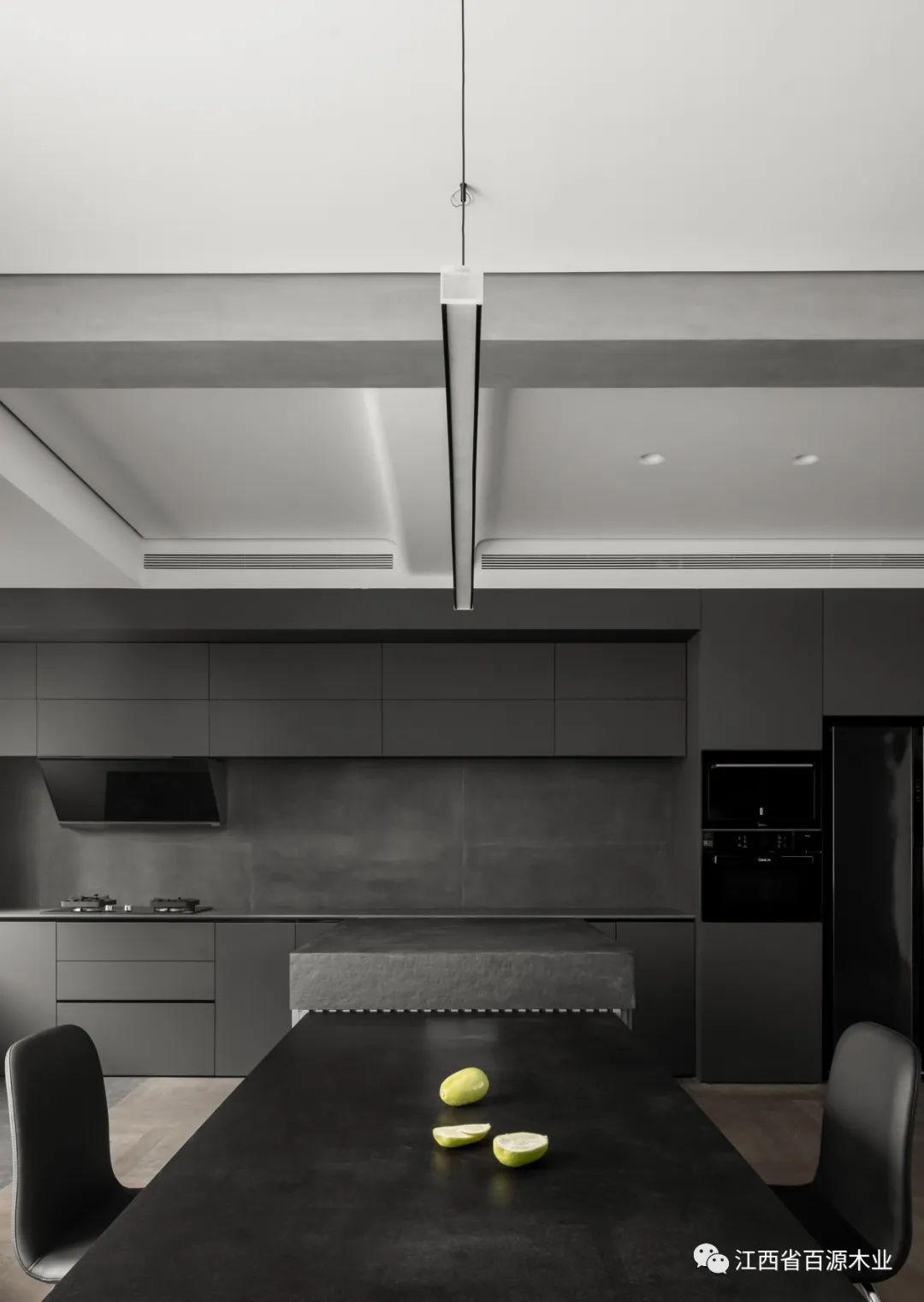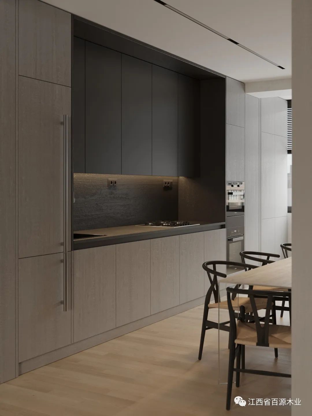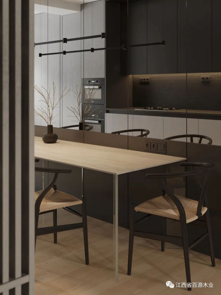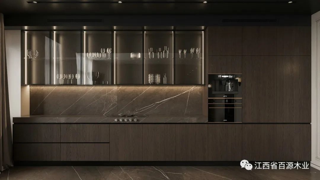 橱柜沿墙面一字排开,以木为视觉引导,延伸出轻奢的格调,岩板作为中岛台材质与操作台相呼应,赋予了它更多的结构惊喜。