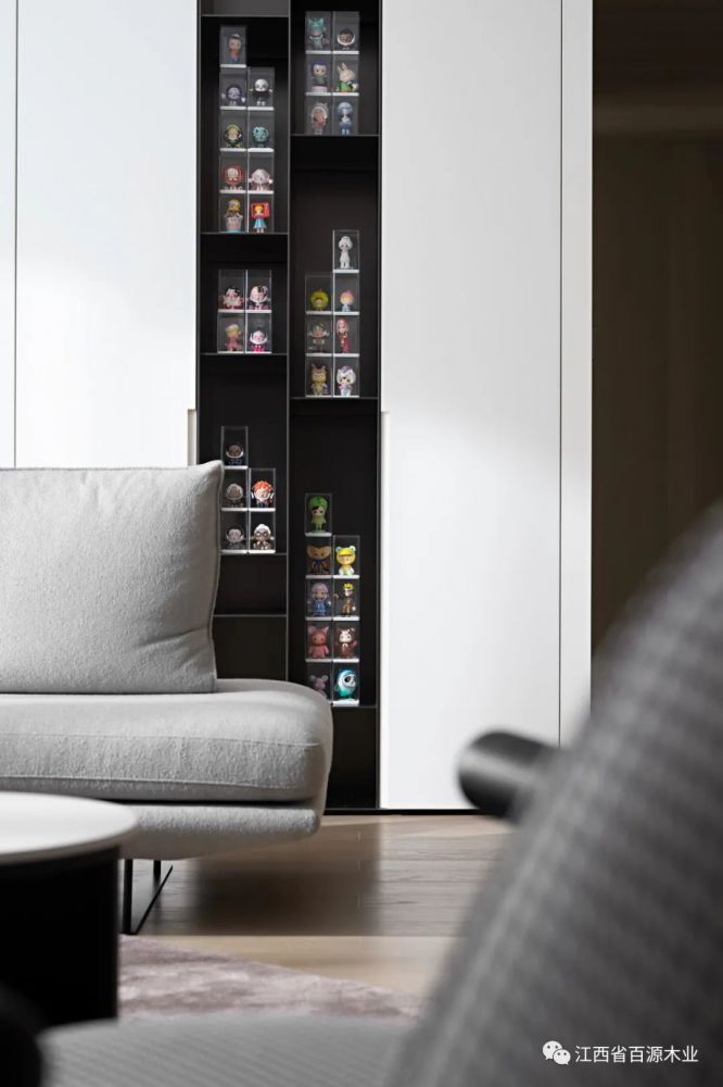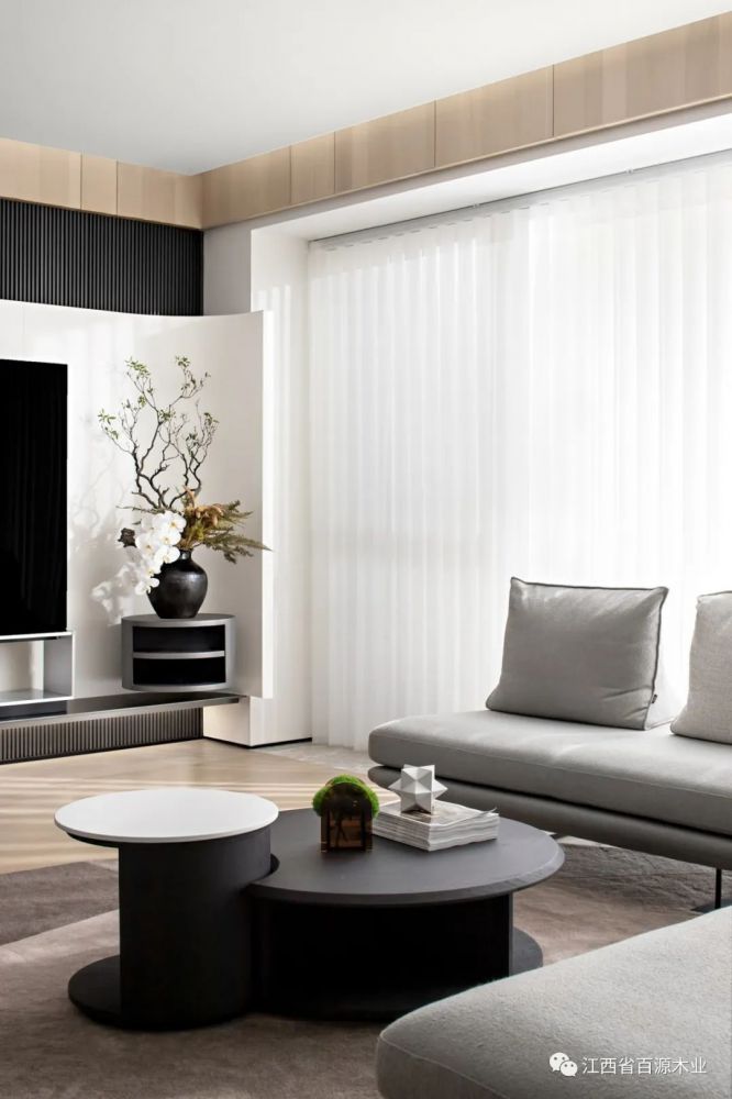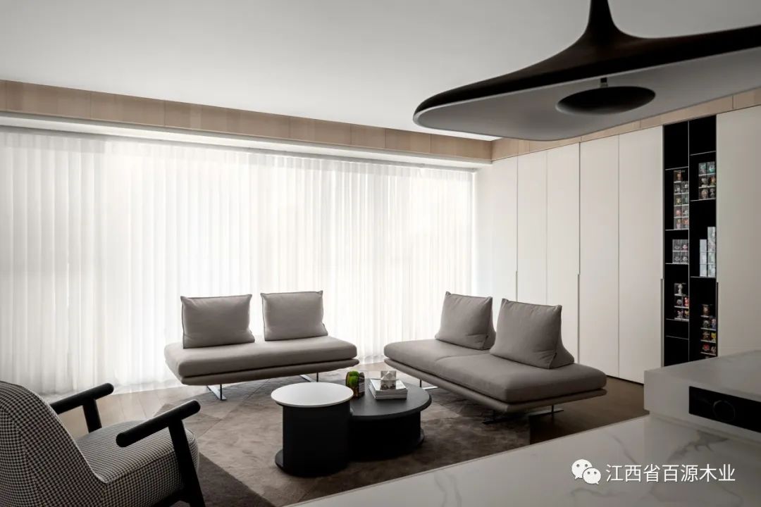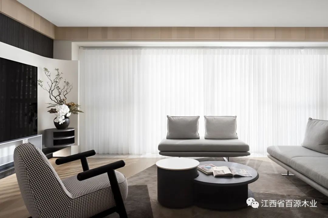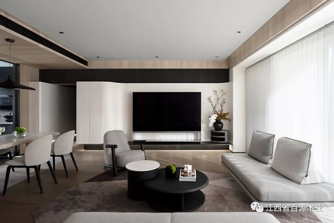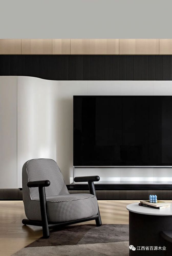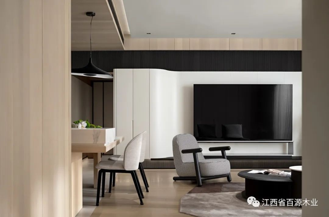 从入户玄关“流淌”至此,弧面延续出高洁的视觉美感,以极简手法凸显电视屏幕一张一弛之间达成了黑色碰撞白色的艺术性。
