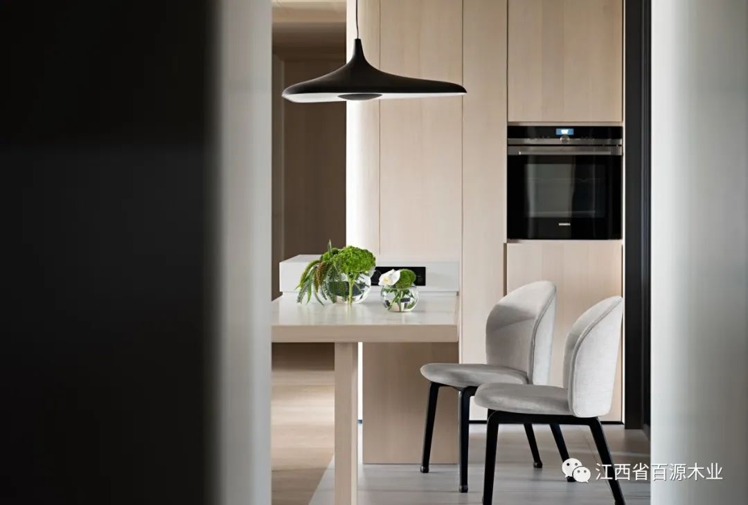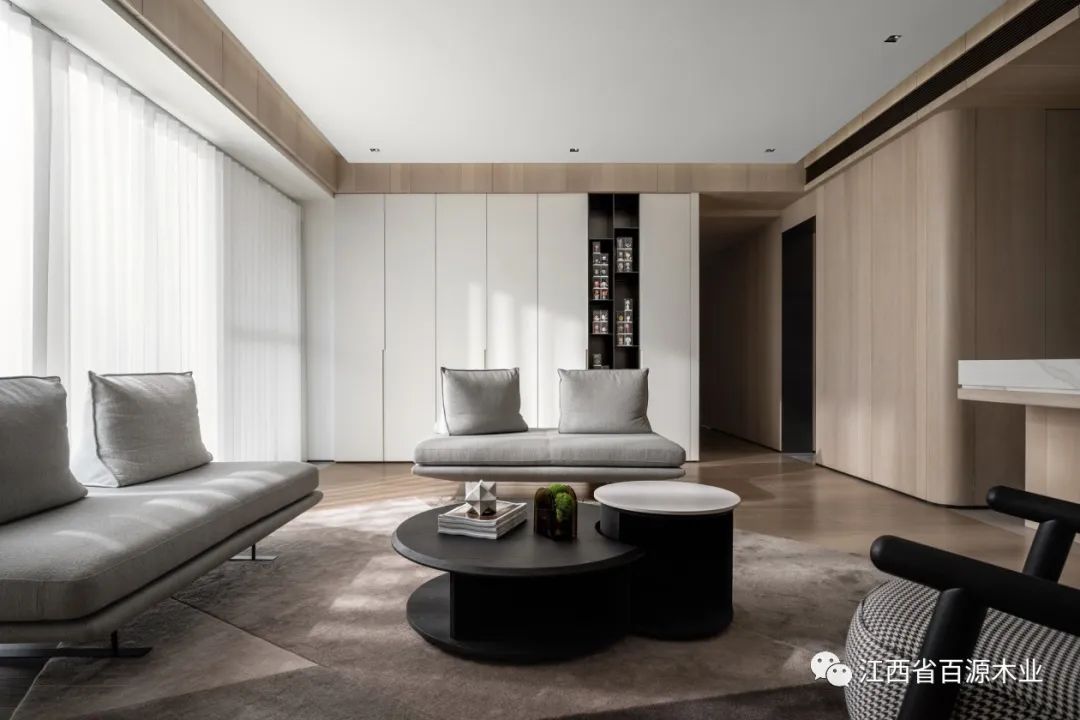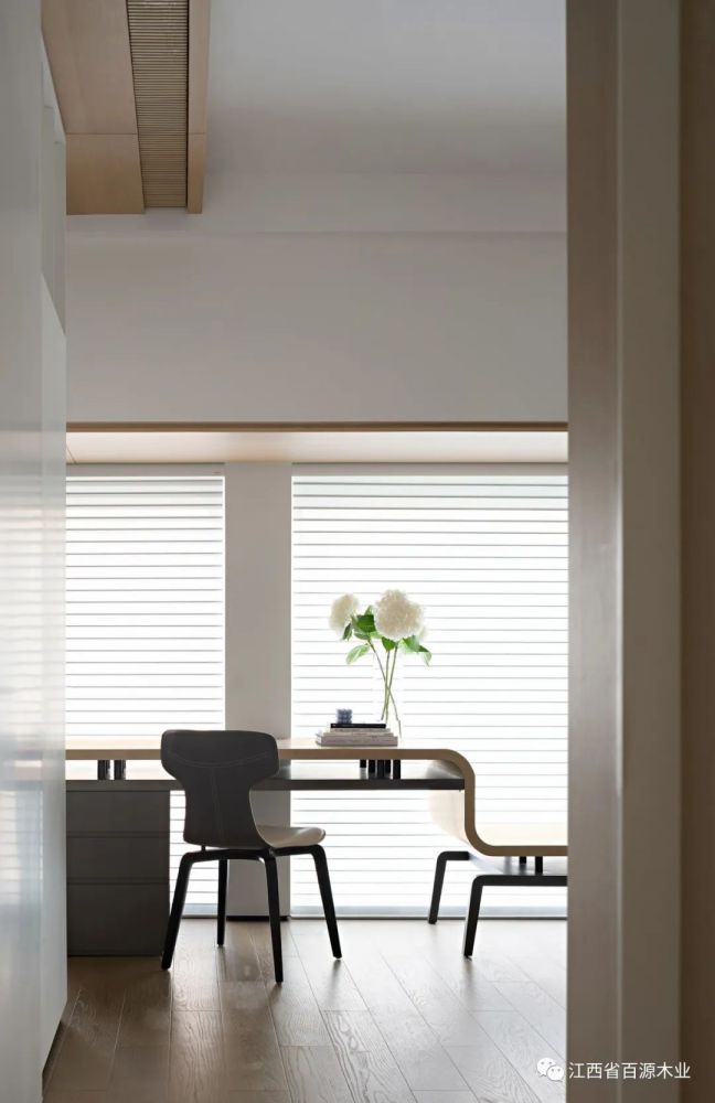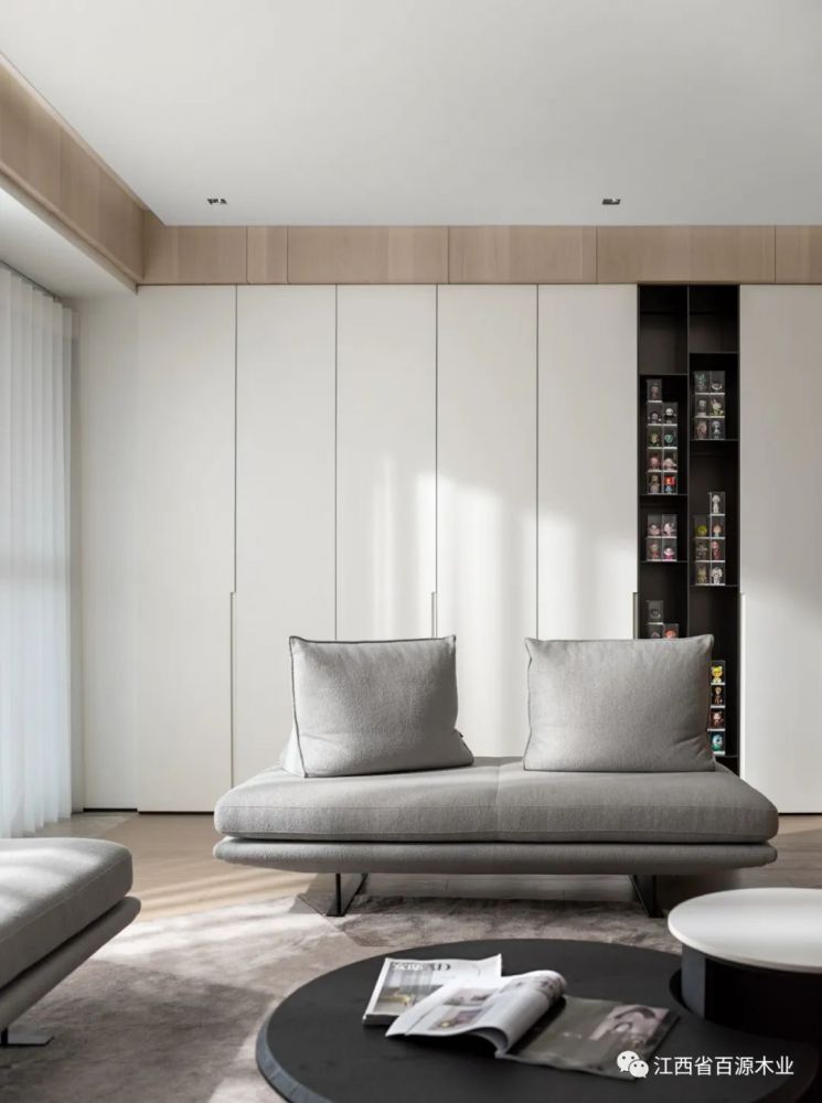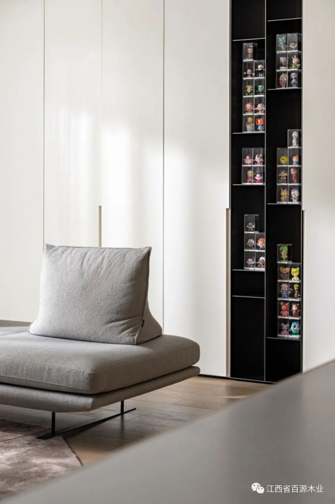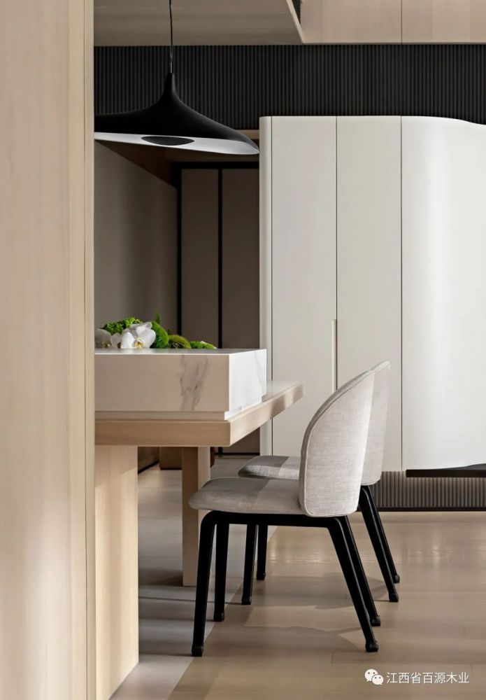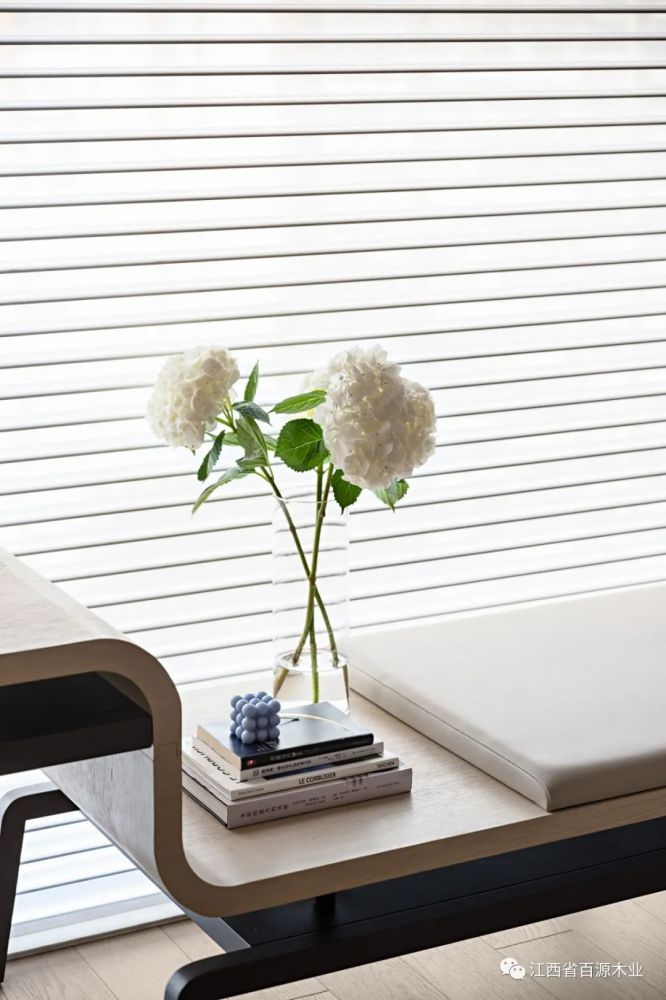 在纯白饰面的映衬下,焕发出清新宁静的气质,和谐排序,渐进延伸通过几何形态的启迪,再次强化空间的韵律。