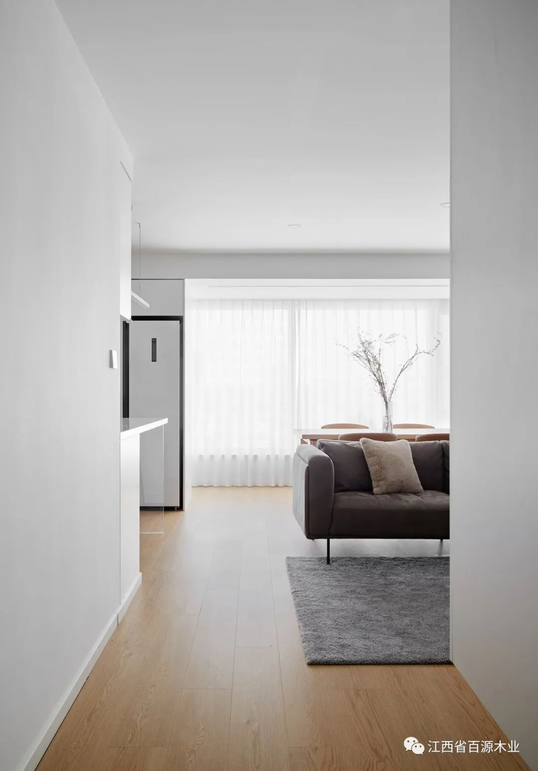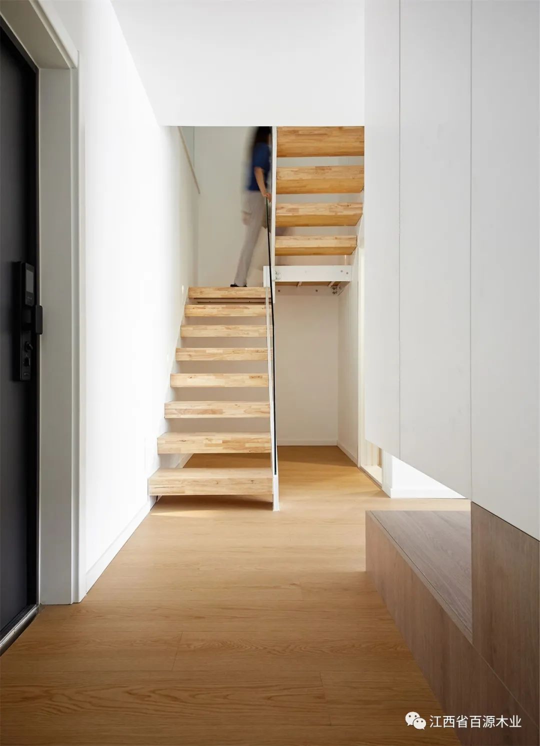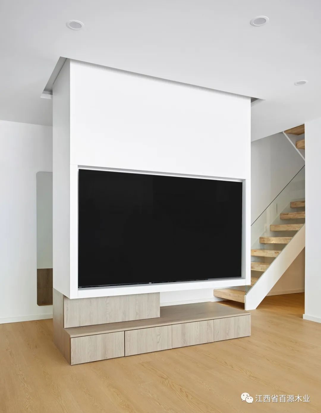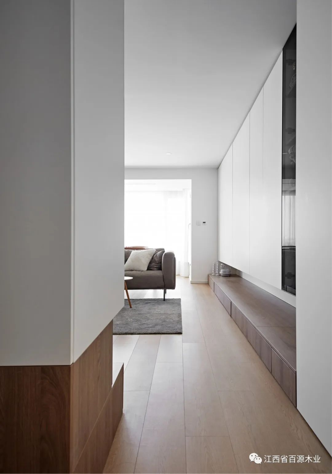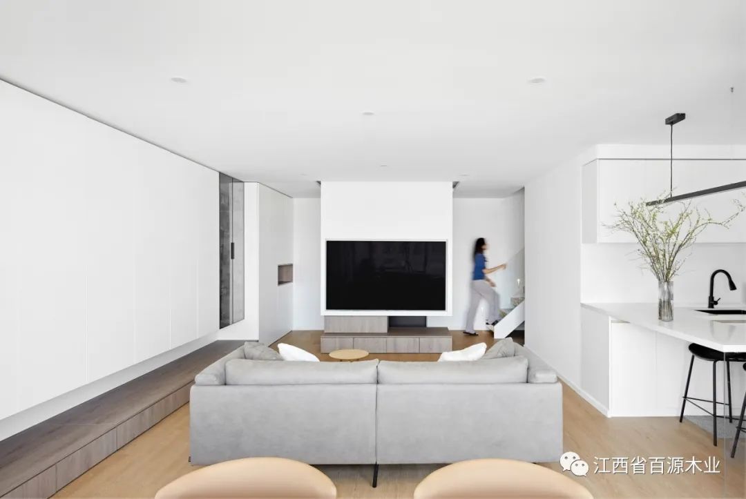 原始空间玄关置入半悬空矩形体块,一面为衣帽柜,面向玄关;一面为电视柜,面向客厅,一物两用,满足不同场景的多种功能需求。