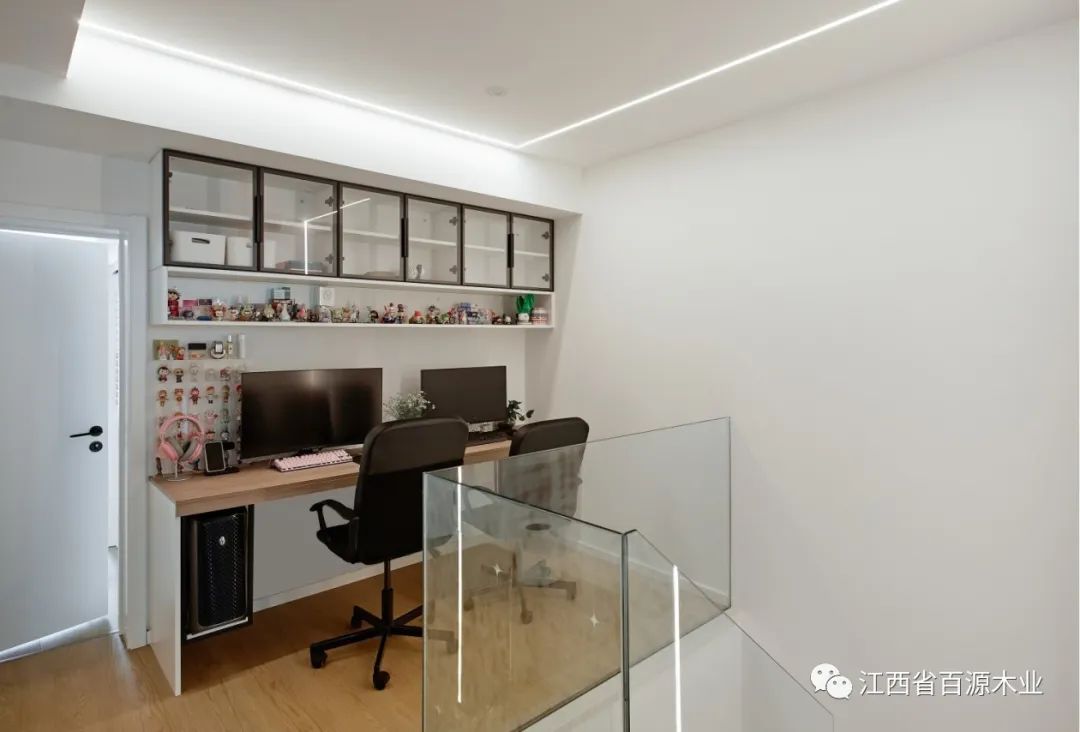 玻璃扶手与悬空踏步增加采光,暴露在外的楼梯结构呈现出一种工业感。在二层楼梯平台处新增电竞区,为业余休闲娱乐提供专属区域。