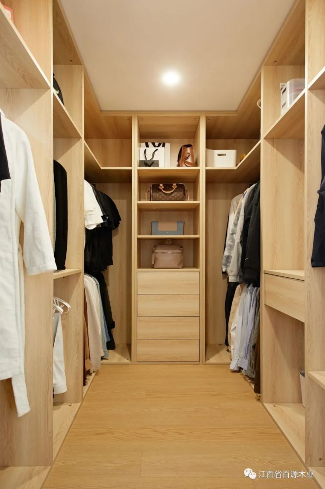 将原本过长的主卧分隔为两个空间,增设步入式衣帽间。以模块化的手法对柜体分隔及尺寸进行规划设计,提升衣物收纳效率。