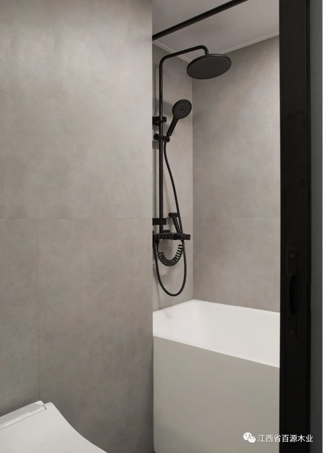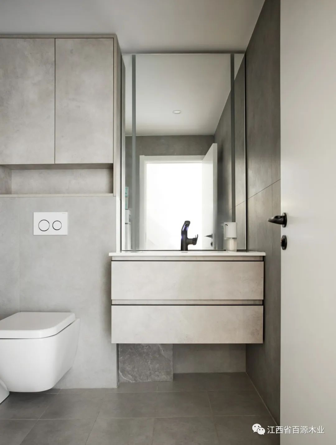 卫生间尺寸与布局优化与调整,增加柜体储物功能。空间采用哑光灰砖,整体色彩统一。