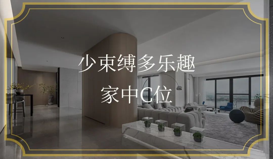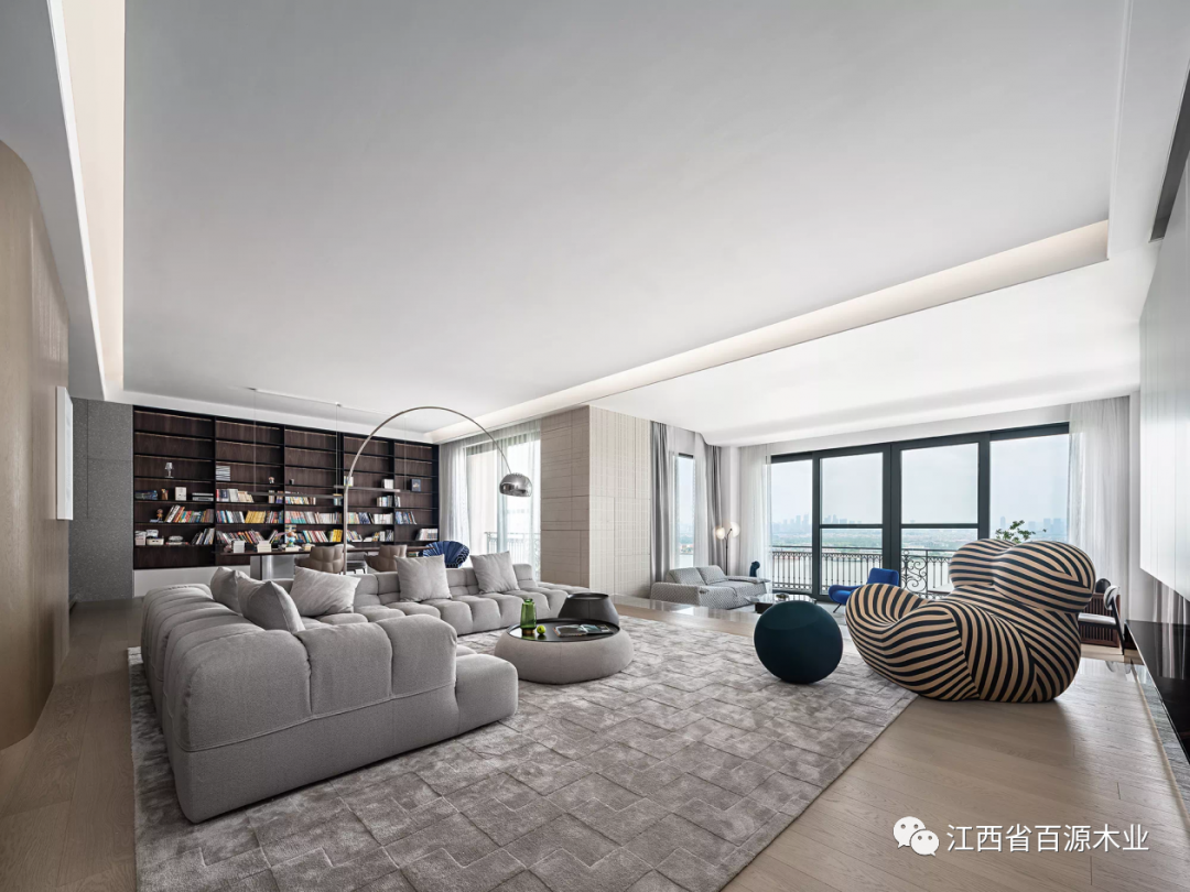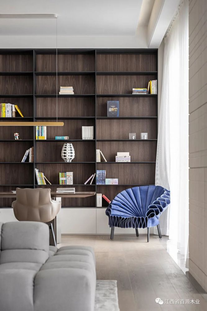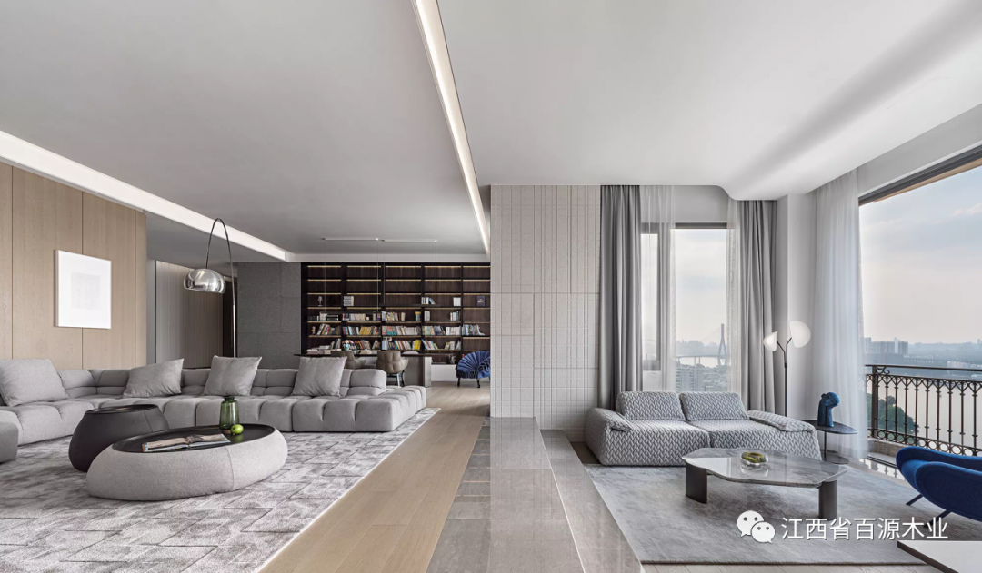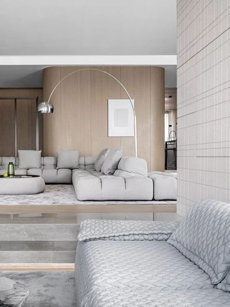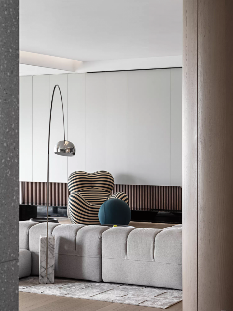 整体极简空间的基础上,沙发背景天然木柜中间融入了虚实变化的方形框架,空间感极强同时在灯光的营造下具备天然的展示与收纳功能。