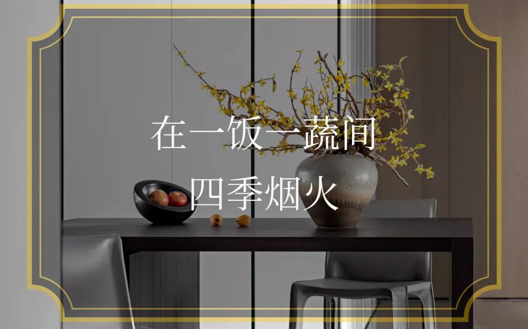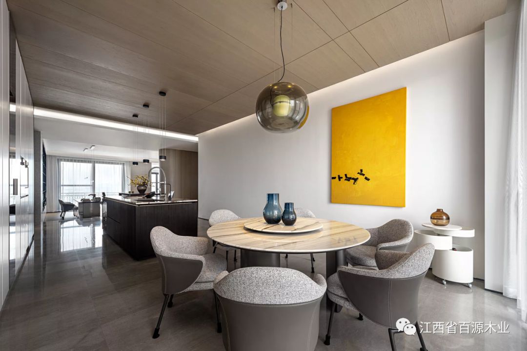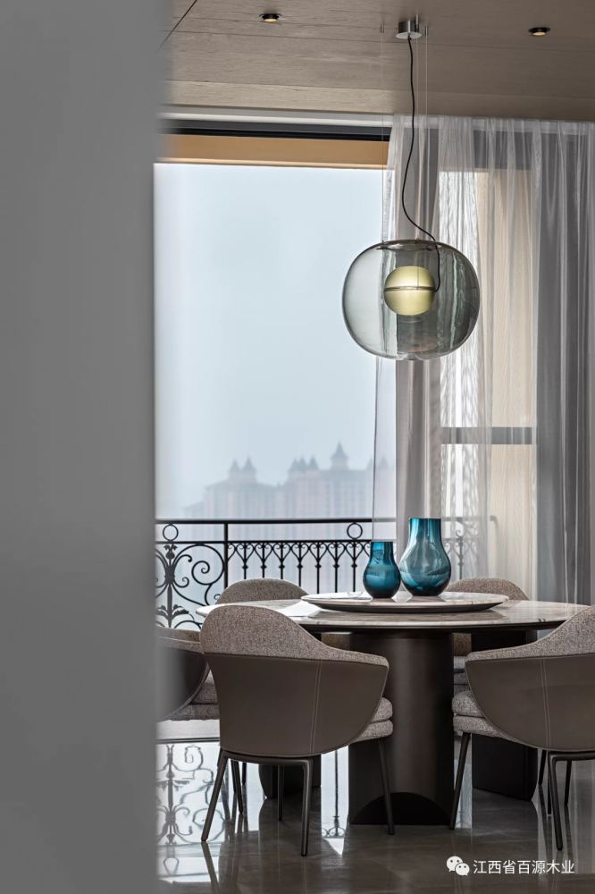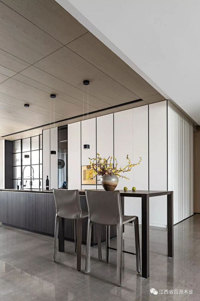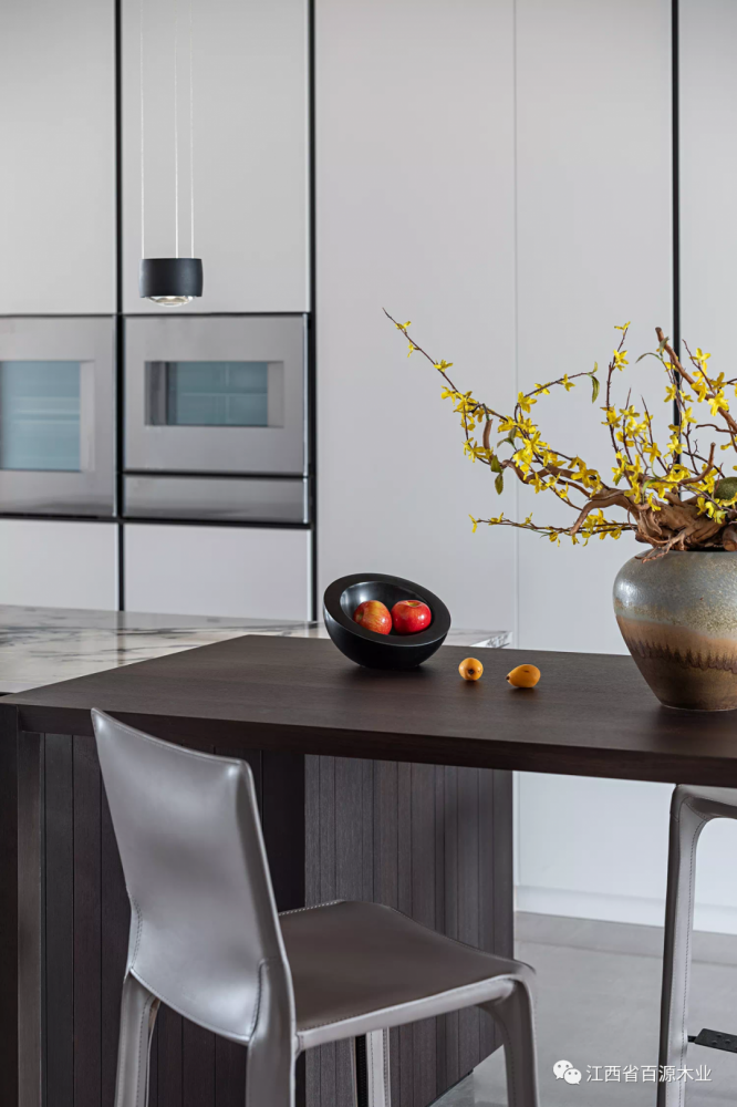 厨房中,造型简洁的深木色餐桌搭配富有设计感的黑色吊灯,勾勒出一种自然而舒适的美感。同时通透的玻璃打破室内外的界限,无缝连接居住空间与自然空间。